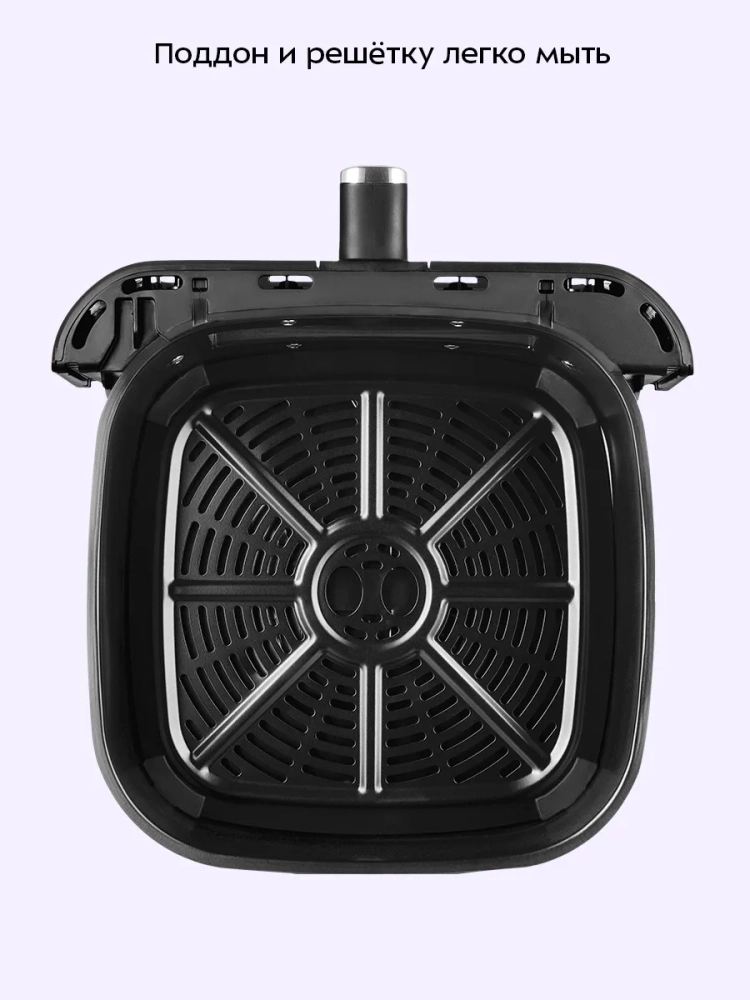 Продукты готовятся на специальной решетке, установленной в поддон. На решетку и поддон нанесено антипригарное покрытие. По окончании приготовления аэрогриль автоматически отключается. Поддон и решетка легко вынимаются и моются.