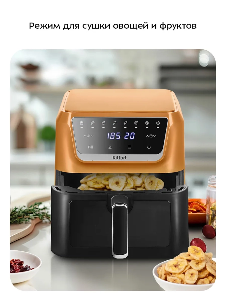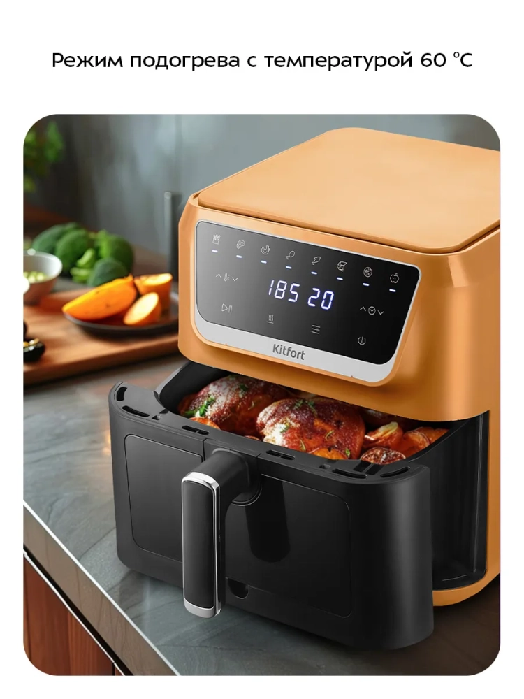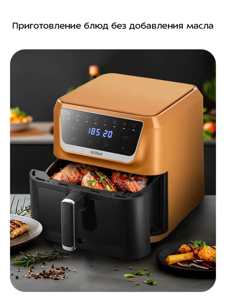 Современный аэрогриль kitfort КТ-8105 позволяет готовить большинство продуктов без добавления масла, при этом они получаются сочными и с хрустящей корочкой.