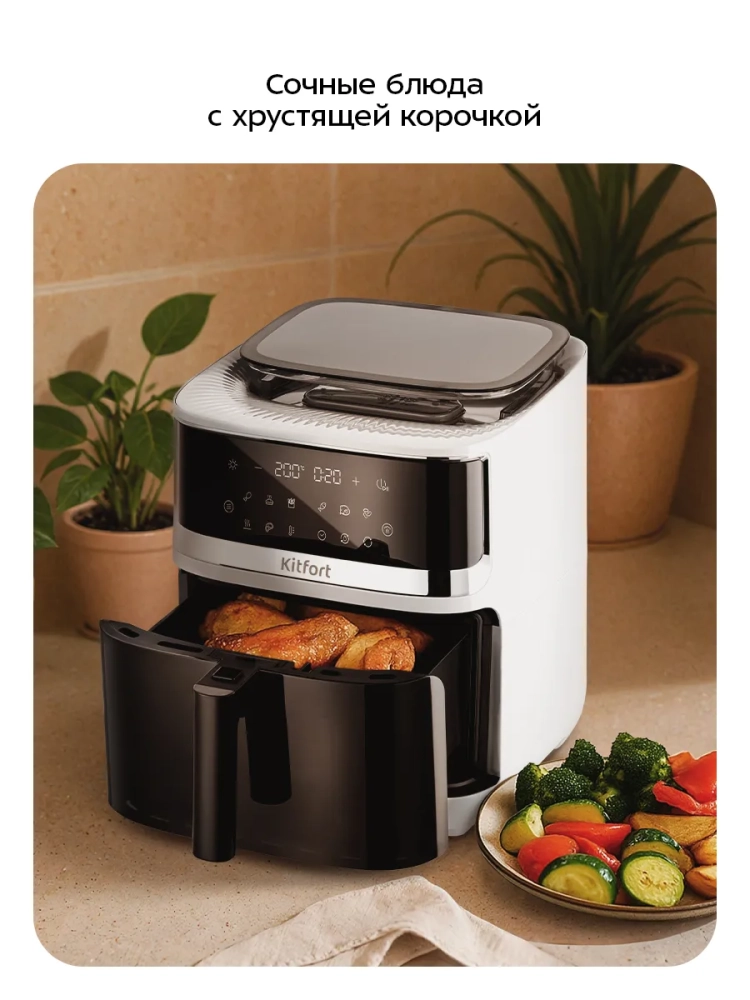 Белый корпус аэрогриля Kitfort гармонично впишется в интерьер любой кухни, добавляя ей современный и стильный вид. Аэрогрили Kitfort отличаются высокой функциональностью и простотой в управлении, что делает их идеальным выбором для тех, кто ценит качество и удобство.