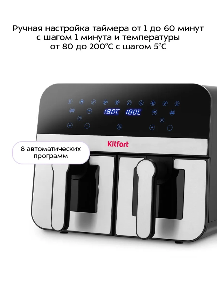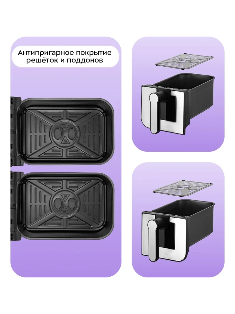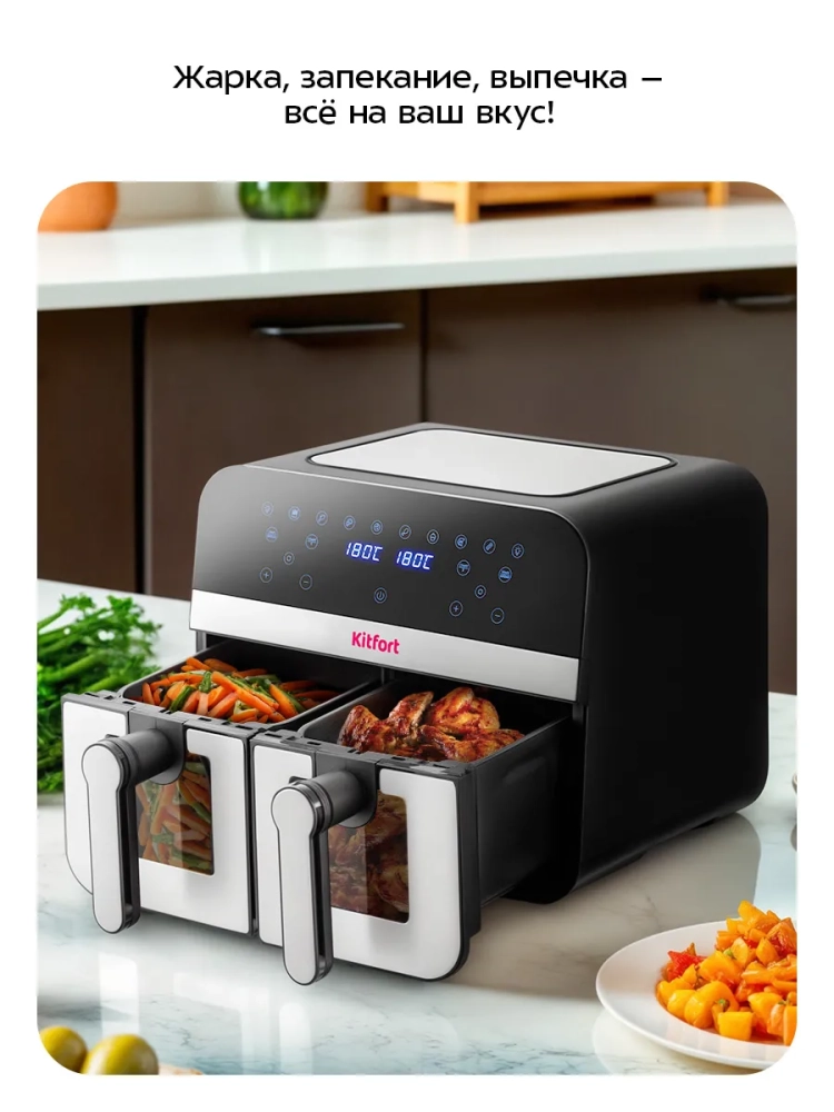 Аэрогриль электрический Kitfort КТ-2273 – это современный прибор с 2 чашами, который станет незаменимым помощником на вашей кухне. С его помощью вы сможете готовить на гриле разнообразные блюда без добавления масла, сохраняя их сочность и создавая аппетитную хрустящую корочку. Благодаря системе циркуляции горячего воздуха продукты равномерно обжариваются со всех сторон, оставаясь нежными внутри и хорошо запеченными снаружи. Этот аэрогриль оснащен двумя нагревателями мощностью по 1200 Вт каждый и двумя поддонами с общей емкостью 9 литров (2 × 4,5 л), что позволяет одновременно готовить два разных блюда с индивидуальными настройками температуры и времени. Сенсорное управление облегчает использование устройства: вы можете выбрать одну из восьми автоматических программ или настроить параметры вручную. На дисплее отображаются температура и время приготовления, что делает процесс максимально удобным. Продукты размещаются на специальных решетках в поддонах с антипригарным покрытием, предотвращающим пригорание пищи. После завершения процесса приготовления аэрогриль автоматически отключается для безопасности использования. Грильница Kitfort КТ-2273 также может использоваться как фритюрница и электрогриль благодаря своей универсальности. Поддон легко вынимается для очистки после использования. Мощность устройства составляет 2400 Вт (по 1200 Вт на каждый нагреватель) благодаря встроенному тэну, а напряжение – ~220–240 В при частоте 50/60 Гц. Температурный диапазон от 80 до 200 °С регулируется с шагом в пять градусов, а таймер можно установить от одной до шестидесяти минут с шагом в одну минуту. Этот кухонный прибор станет незаменимой техникой на вашей кухне благодаря своим возможностям выпечки и жарки без лишних усилий!