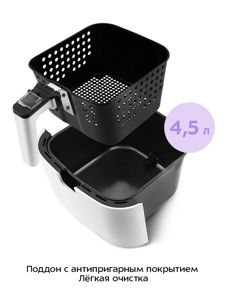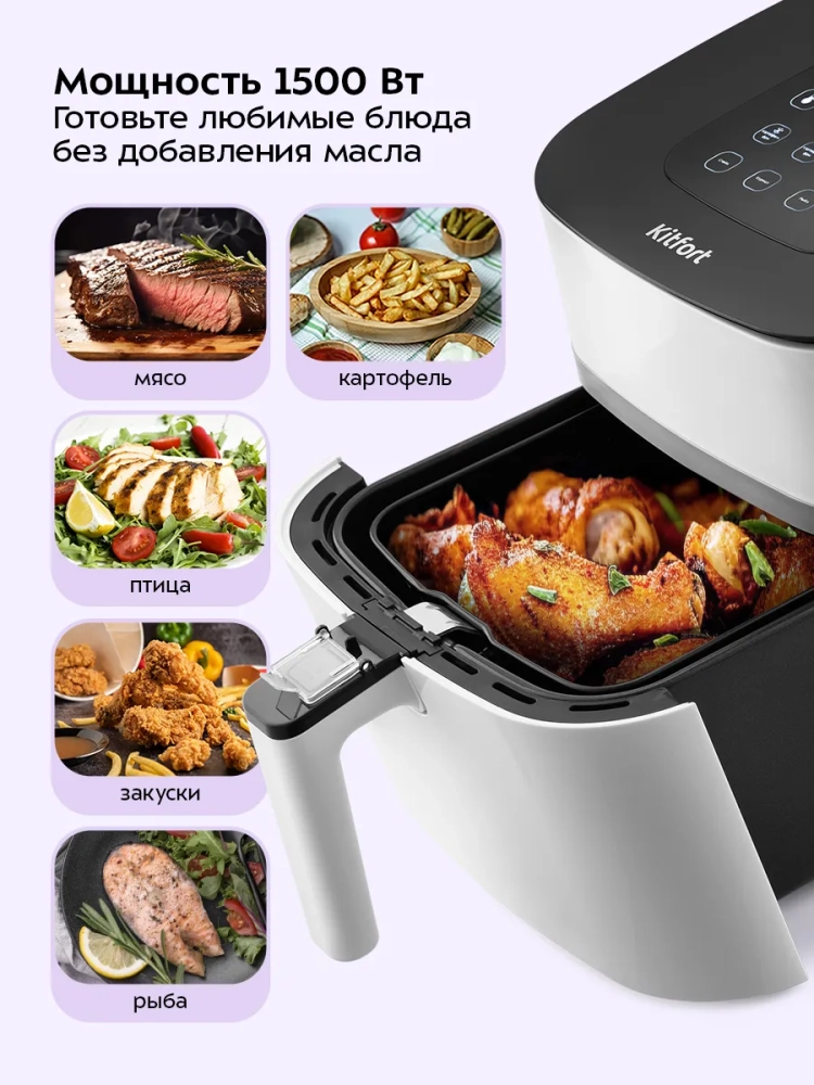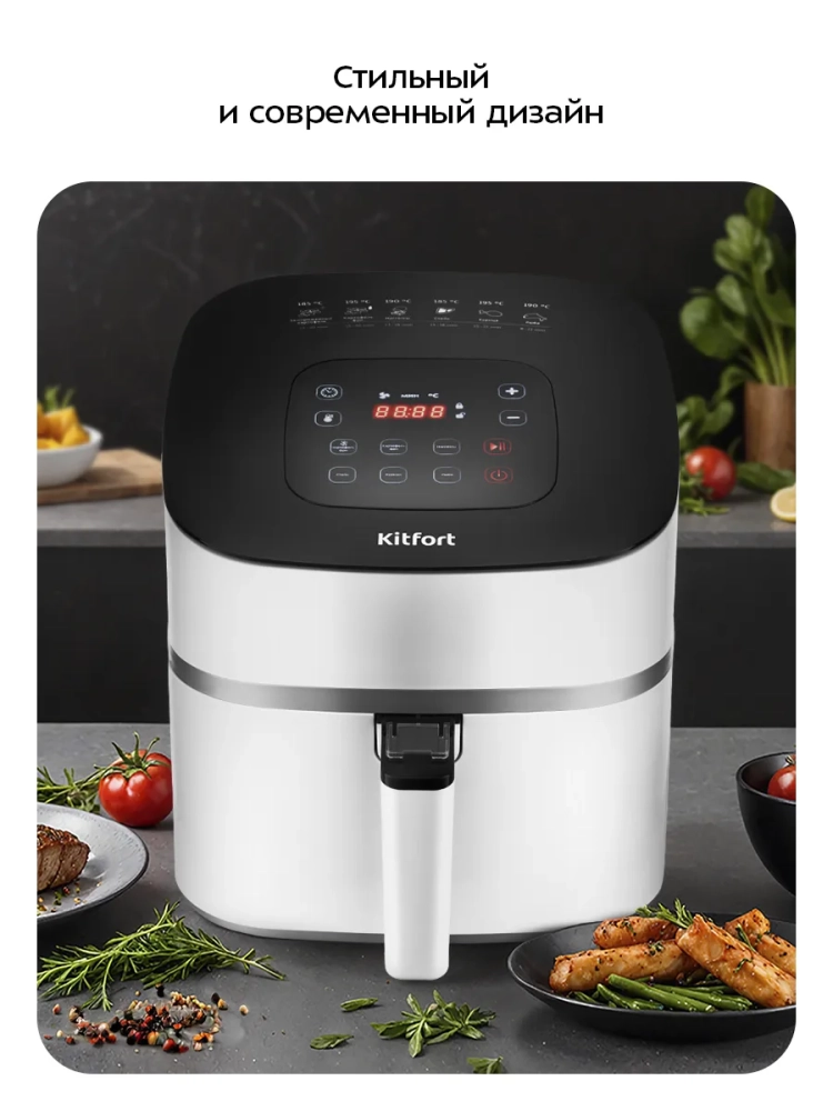 Аэрогриль электрический Kitfort КТ-2217 — это современный прибор, который сочетает в себе функции аэрогриля, электрогриля, печи, аэрофритюрницы, гриля и духовки. Он позволяет готовить разнообразные блюда, в том числе и выпечку, без добавления масла благодаря системе циркуляции горячего воздуха. Продукты обжариваются равномерно со всех сторон, оставаясь нежными внутри и приобретая хрустящую корочку снаружи. Этот электрический аэрогриль оснащен электронным управлением и предлагает 6 автоматических программ для удобства использования. На дисплее устройства отображаются температура и время приготовления, что позволяет точно контролировать процесс готовки. Внутри прибора находится специальная корзина для продуктов, которая вставляется в поддон с антипригарным покрытием. Это обеспечивает легкость ухода за устройством: корзина и поддон легко вынимаются и моются после использования. С мощностью 1500 Вт аэрогриль Kitfort КТ-2217 способен быстро приготовить вкусные блюда на любой вкус. Объем его составляет 4.5 литра, что делает его идеальным выбором для семейного использования или небольших компаний друзей. Этот настольный прибор не только функционален, но также отличается стильным дизайном, который украсит любую кухню. Аэрогриль автоматически отключается по окончании приготовления пищи, обеспечивая безопасность эксплуатации.