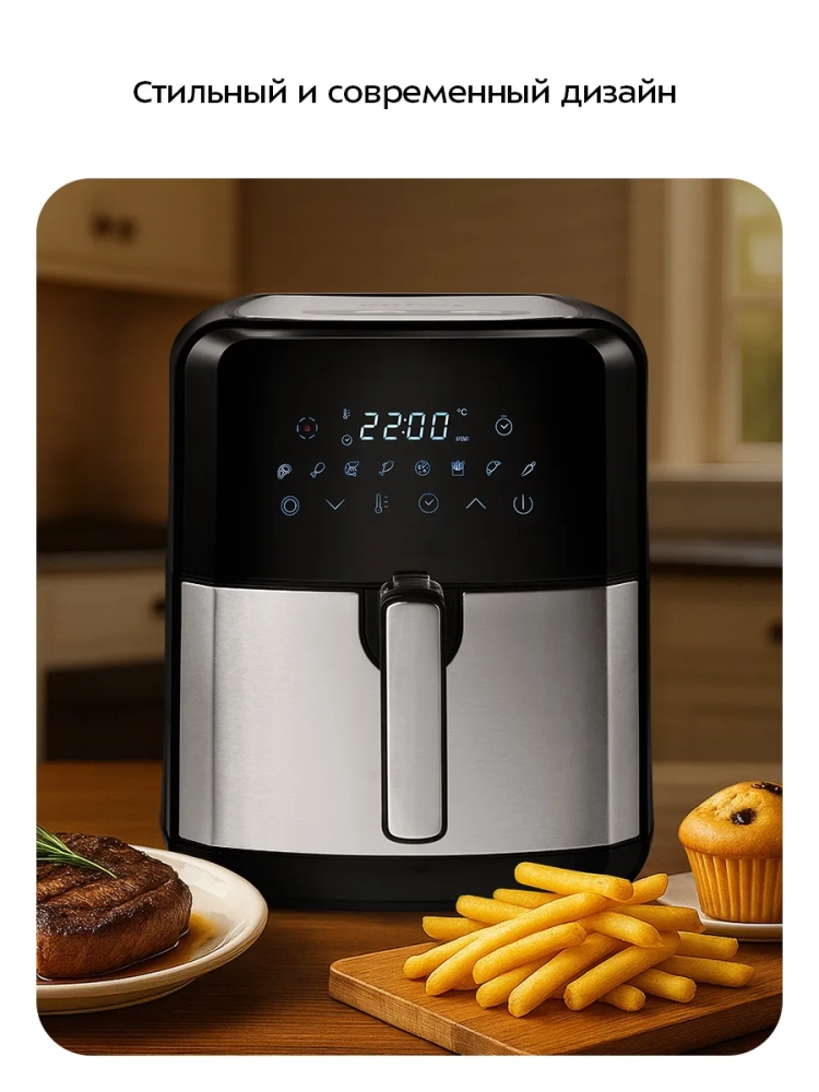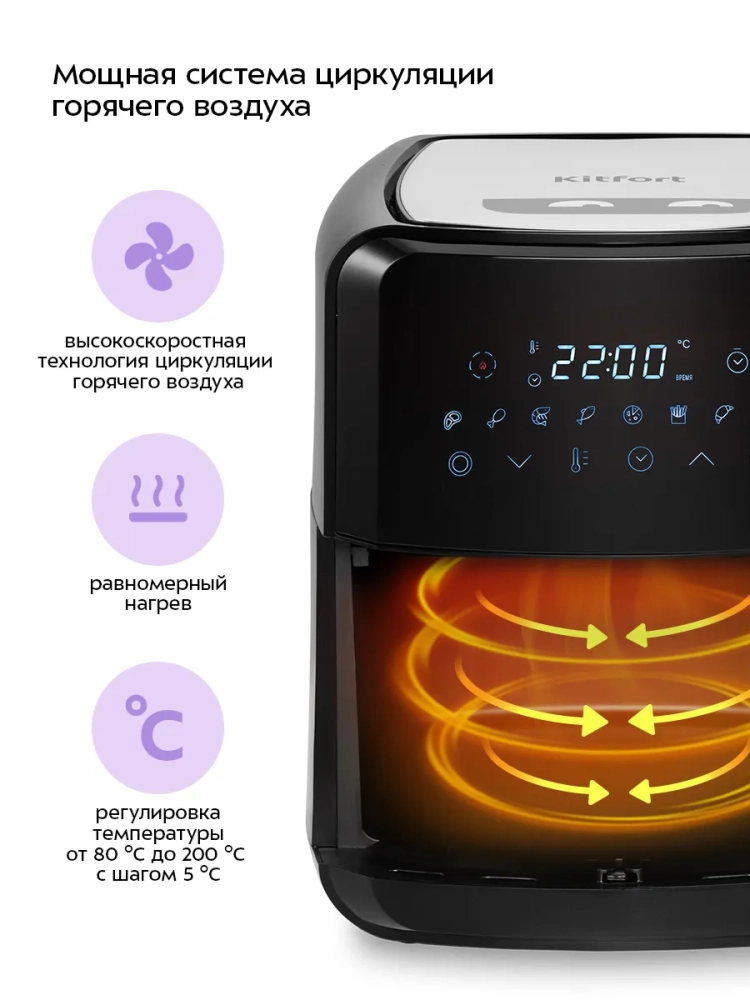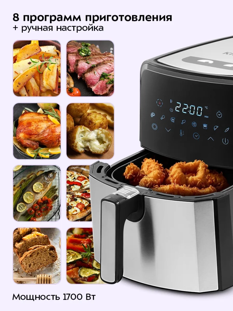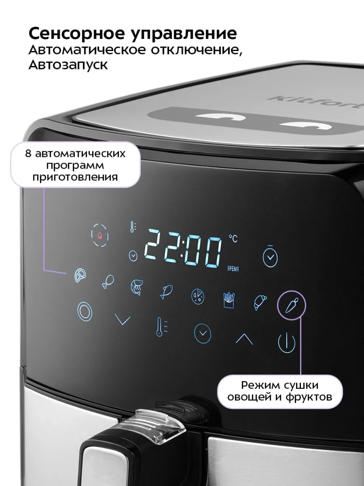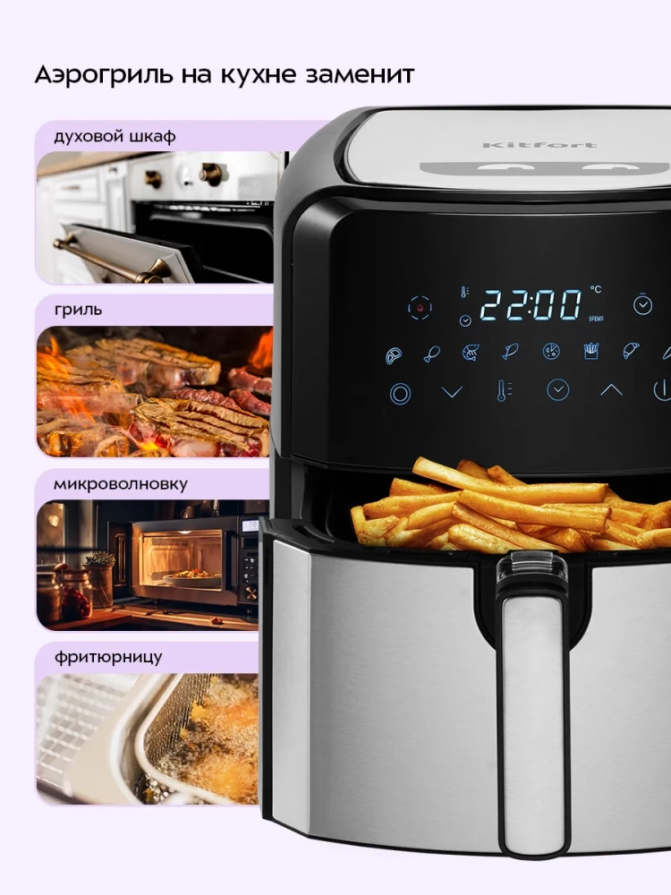 Аэрогриль электрический Kitfort КТ-2239 — это многофункциональное устройство, которое станет незаменимым помощником на вашей кухне. Он сочетает в себе функции аэрогриля, фритюрницы, духовки и сушилки для овощей и фруктов. Благодаря специальной программе "Сушка овощей и фруктов" с таймером от 2 до 24 часов и температурным диапазоном от 40 до 80 градусов, вы сможете легко приготовить полезные закуски без масла. Электрический аэрогриль Kitfort оснащен системой циркуляции горячего воздуха, что позволяет равномерно обжаривать продукты со всех сторон. Это обеспечивает нежность внутри и хрустящую корочку снаружи без риска пригорания. Устройство имеет сенсорное управление с восемью автоматическими программами приготовления и возможностью ручной настройки параметров. Объем корзины составляет 4,5 литра, что позволяет готовить большие порции за один раз. Корзина вставляется в поддон с антипригарным покрытием для удобства использования и легкой очистки после приготовления блюд. Поддон также легко вынимается для мытья. На дисплее отображаются температура и время приготовления, что делает процесс готовки простым даже для новичков на кухне. Аэрогриль автоматически отключается по окончании программы, обеспечивая безопасность использования. Этот электрический гриль идеально подходит как для ежедневного использования дома, так и для особых случаев благодаря своей универсальности. Независимо от того хотите ли вы приготовить курицу или рыбу с хрустящей корочкой или высушить фрукты — Kitfort справится со всеми задачами!