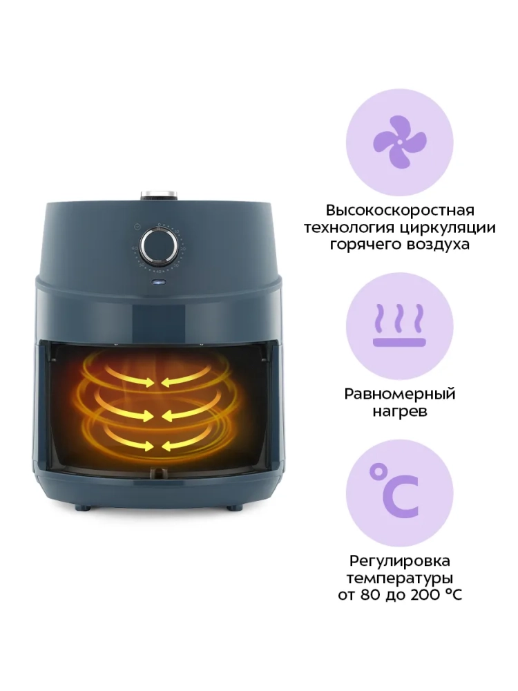 Аэрогриль электрический Kitfort КТ-8118 — это современный кухонный прибор, который станет незаменимым помощником на вашей кухне. С его помощью можно готовить большинство блюд без добавления масла, сохраняя их сочность и создавая аппетитную хрустящую корочку. Этот прибор позволяет приготовить более здоровую пищу благодаря системе циркуляции горячего воздуха, которая равномерно обжаривает продукты со всех сторон. Электроаэрогриль оснащен механическим управлением, что позволяет легко установить температуру от 80 до 200 °С и время приготовления до 60 минут. Это бытовое устройство идеально подходит для тех, кто ценит удобство и простоту в использовании. Продукты готовятся в специальной корзине с антипригарным покрытием, установленной в поддон. Поддон также имеет антипригарное покрытие и легко моется после использования. Его емкость составляет 3,2 литра — идеальный объем для приготовления разнообразных блюд на семью или небольшую компанию друзей. Аэрогриль автоматически отключается по окончании процесса готовки, обеспечивая безопасность использования. Этот настольный гриль не требует постоянного присутствия на кухне благодаря встроенному вентилятору: все блюда получаются равномерно прожаренными без непропеченных участков. Размер устройства составляет всего 280 х 351 х 340 мм при длине шнура в 0,6 м — компактные габариты позволяют разместить его даже на небольшой кухне.