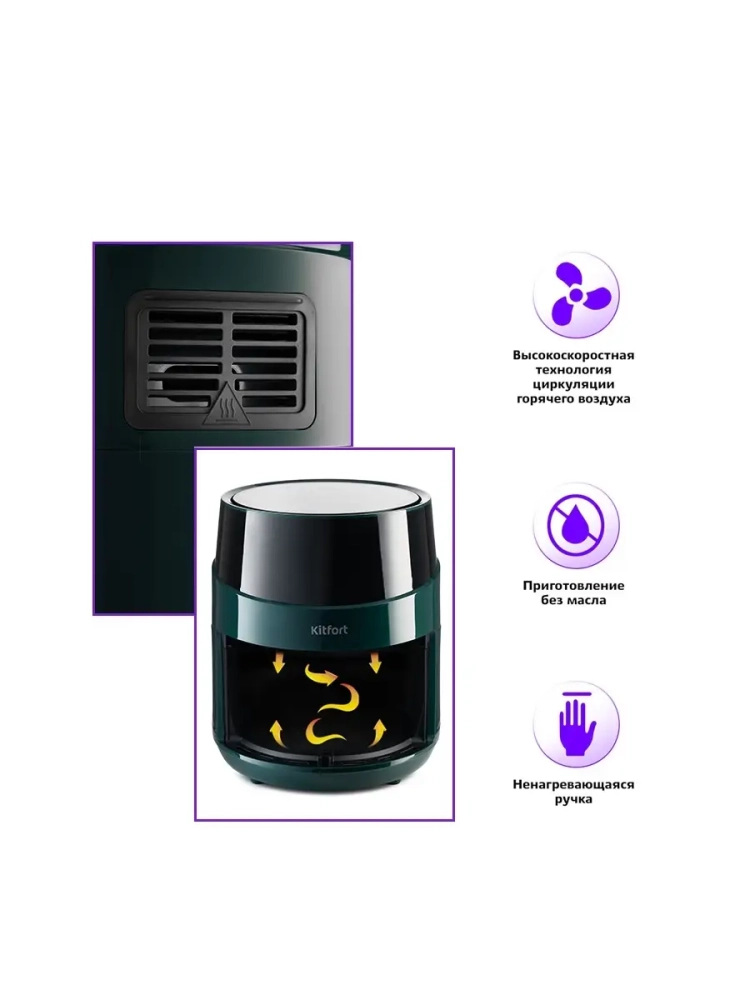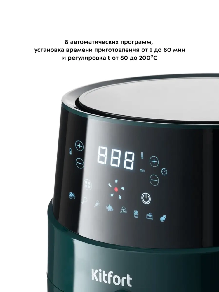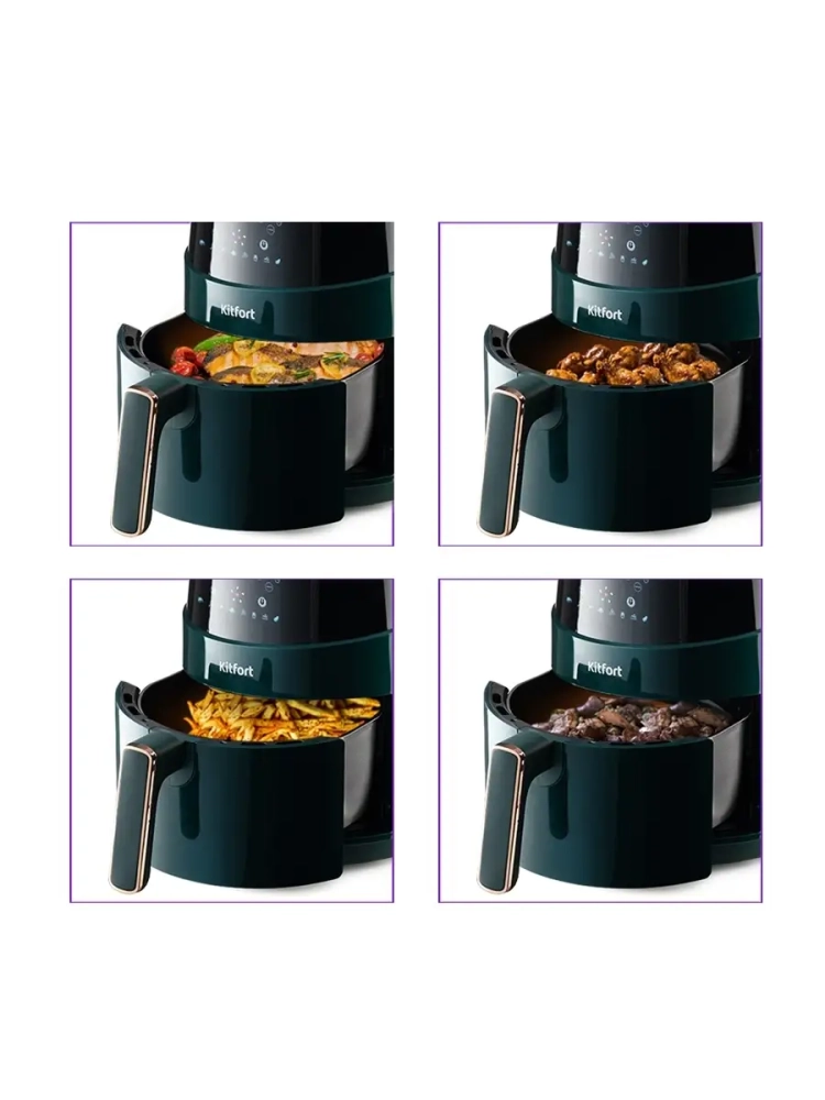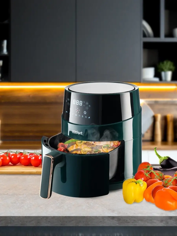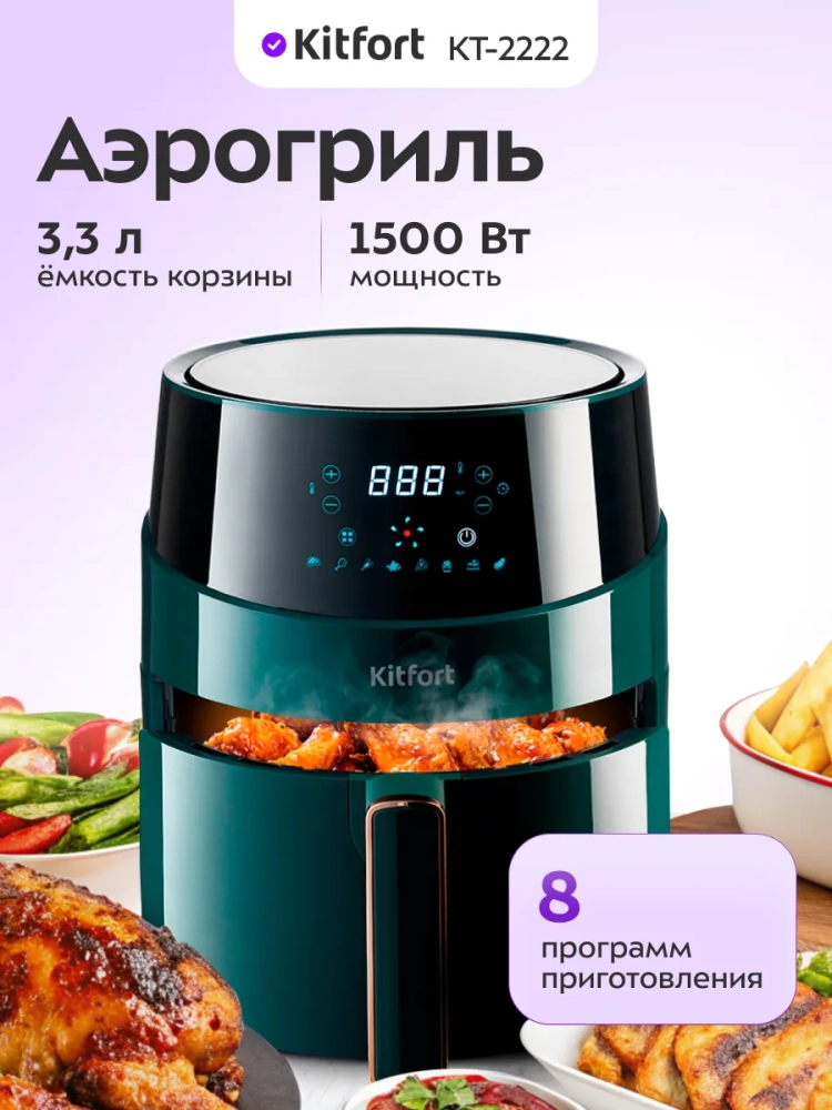 Аэрогриль электрический Kitfort КТ-2222 — это многофункциональный прибор, который станет незаменимым помощником на вашей кухне. С его помощью можно готовить разнообразные блюда без добавления масла, что делает их более полезными и менее калорийными. Этот аэрогриль может использоваться как фритюрница, электрогриль и духовка, обеспечивая равномерное обжаривание продуктов благодаря системе циркуляции горячего воздуха. Продукты получаются с хрустящей корочкой снаружи и нежной текстурой внутри. Электрический аэрогриль Kitfort оснащен электронным управлением и предлагает 8 автоматических программ приготовления. На дисплее отображается температура и время приготовления, что позволяет легко контролировать процесс готовки. Чаша объемом 3.3 литра вмещает достаточное количество продуктов для всей семьи. В комплект входит решетка для гриля, которая устанавливается в поддоне с антипригарным покрытием. Это обеспечивает легкость очистки после использования — решетка и поддон легко вынимаются и моются вручную или в посудомоечной машине. Этот кухонный прибор мощностью 1500 Вт быстро нагревается до нужной температуры, экономя ваше время на приготовление пищи. Аэрогриль автоматически отключается по окончании программы, что делает его безопасным в использовании. Техника Kitfort КТ-2222 идеально подходит для выпечки различных блюд: от мяса до овощей или десертов. Его стильный дизайн гармонично впишется в интерьер любой кухни.