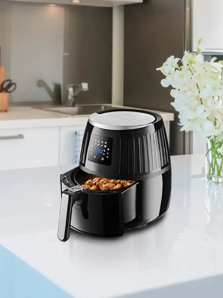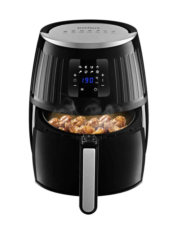 Современный аэрогриль Kitfort КТ-2226 интересен не только стильным дизайном: он может использоваться как аэрогриль, а также как аэрофритюрница и духовка. Для приготовления продуктов в аэрогриле не нужно масло, а если хочется его добавить, например, для создания очень хрустящей корочки или для ароматизации масляно-травяной смесью, то можно просто слегка смазать курицу, рыбу или отбивную с помощью силиконовой кисточки. Так вы получаете более здоровую и полезную пищу. Аэрогриль оснащен сенсорным управлением, он имеет 7 автоматических программ и программу с ручными настройками. На дисплее попеременно отображаются температура и время приготовления. Продукты готовятся в специальной корзине, вставленной в поддон. И корзина и поддон с антипригарным покрытием. По окончании приготовления аэрогриль автоматически отключается. Поддон с корзиной легко вынимаются и моются.