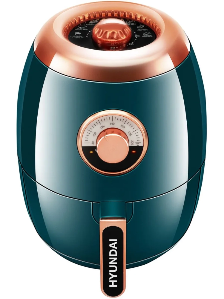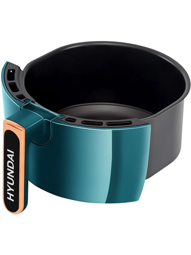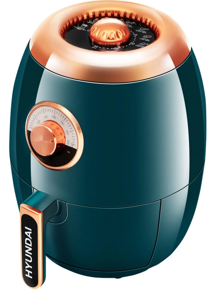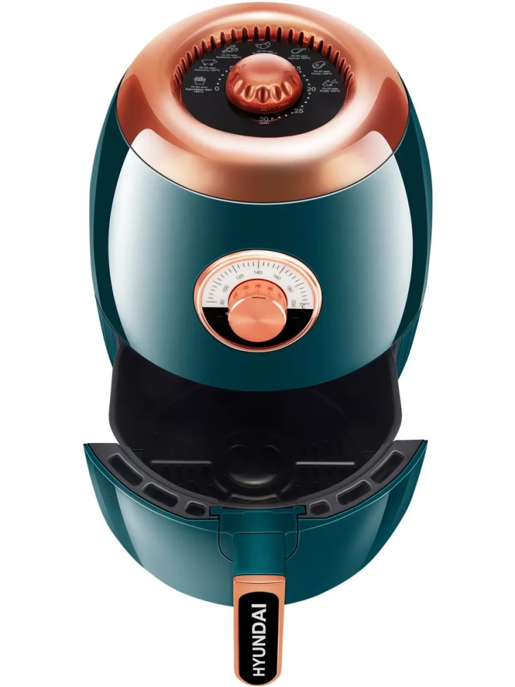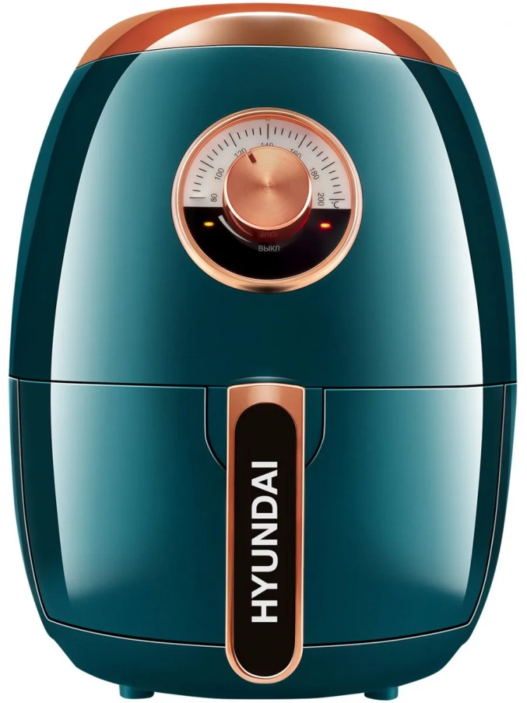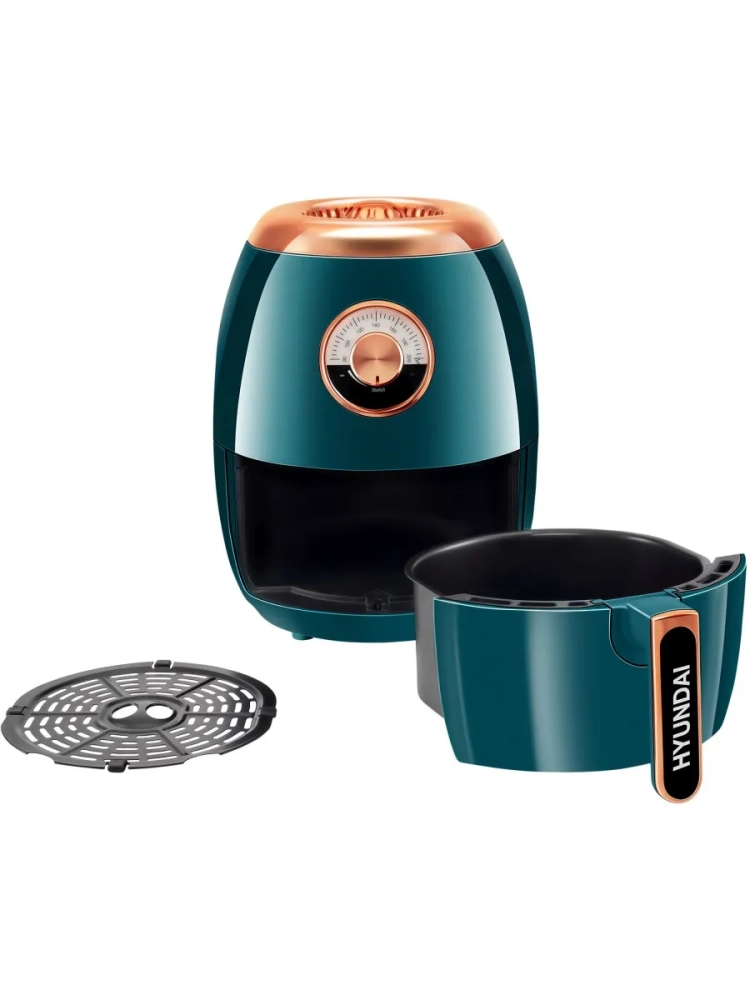 Аэрогриль Hyundai HYF-3553 темно-зеленый/золотистый, мощность 1350Вт, нагревательный элемент: ТЭН. Съёмный поддон имеет антипригарное покрытие, благодаря чему он легко отмываются после использования.