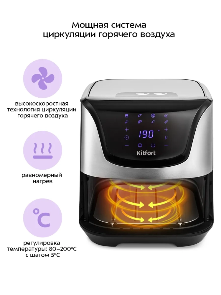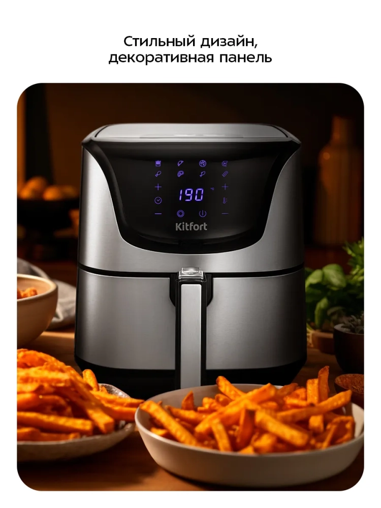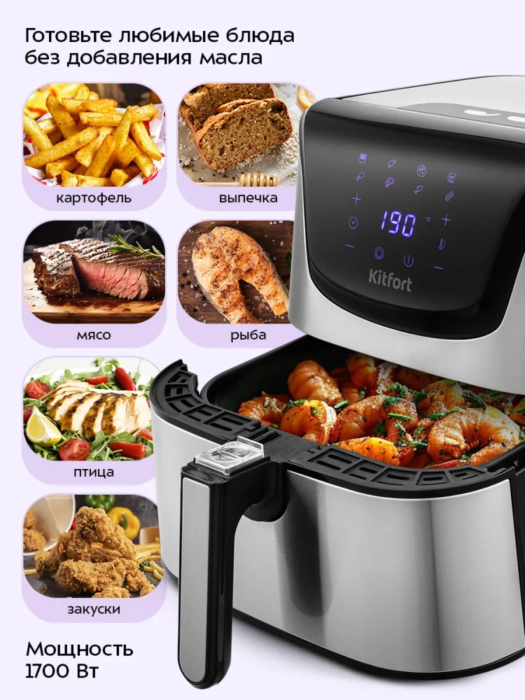 Аэрогриль КТ-2232 от Kitfort — это современное устройство, которое сочетает в себе функции аэрогриля, электрогриля, аэрофритюрницы и духовки. Благодаря этому прибору вы сможете готовить разнообразные блюда, в том числе и выпечку, без использования масла, что делает пищу более здоровой и полезной. Однако при желании можно добавить немного масла для создания хрустящей корочки или ароматизации блюд масляно-травяной смесью. Для этого достаточно слегка смазать курицу, рыбу или отбивную с помощью силиконовой кисточки. Основное преимущество аэрогриля Kitfort заключается в системе циркуляции горячего воздуха, которая обеспечивает равномерное обжаривание продуктов со всех сторон. Устройство оснащено сенсорным управлением и предлагает 8 автоматических программ приготовления, а также возможность ручной настройки параметров. На дисплее отображаются температура и время приготовления. Продукты размещаются в специальной корзине с антипригарным покрытием, которая вставляется в поддон. Поддон также имеет антипригарное покрытие для удобства использования и легкости очистки после готовки. По окончании процесса приготовления аэрогриль автоматически отключается для вашей безопасности. Этот гриль идеально подходит для любителей картофеля фри благодаря своей способности готовить его без лишнего жира. Аэрогриль Kitfort станет незаменимым настольным помощником на вашей кухне благодаря своей многофункциональности и простоте использования.