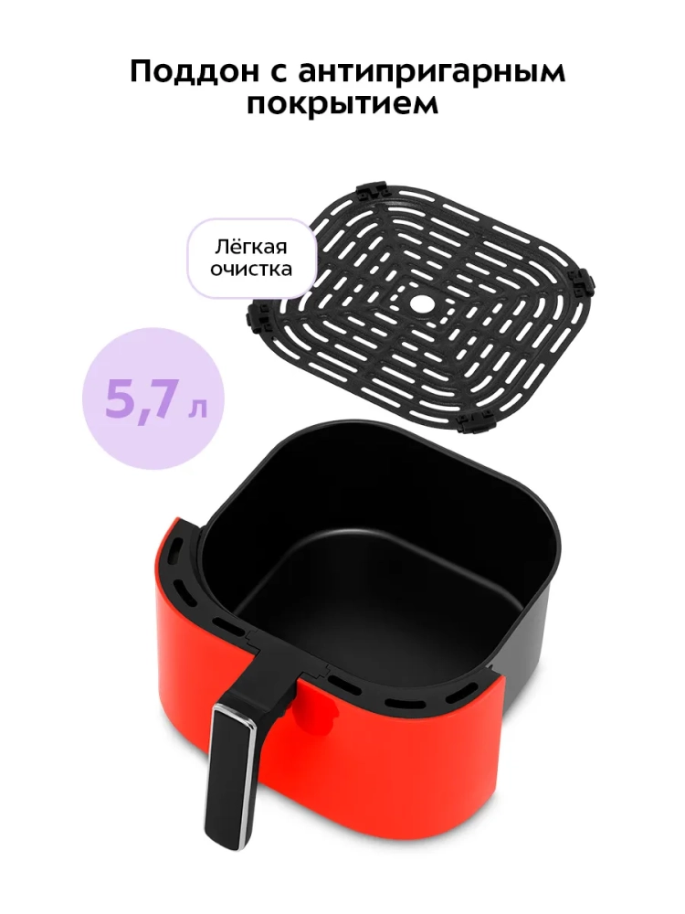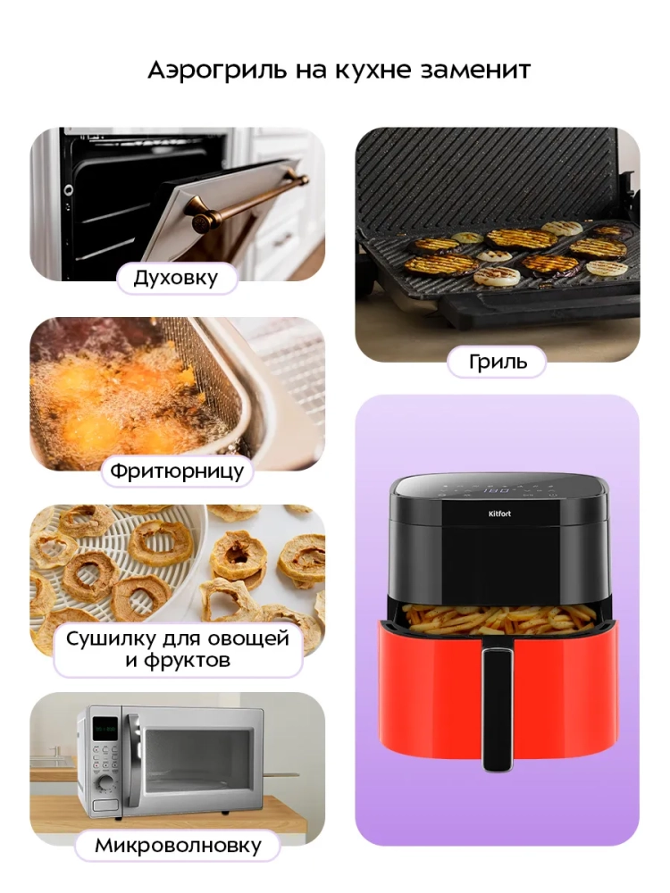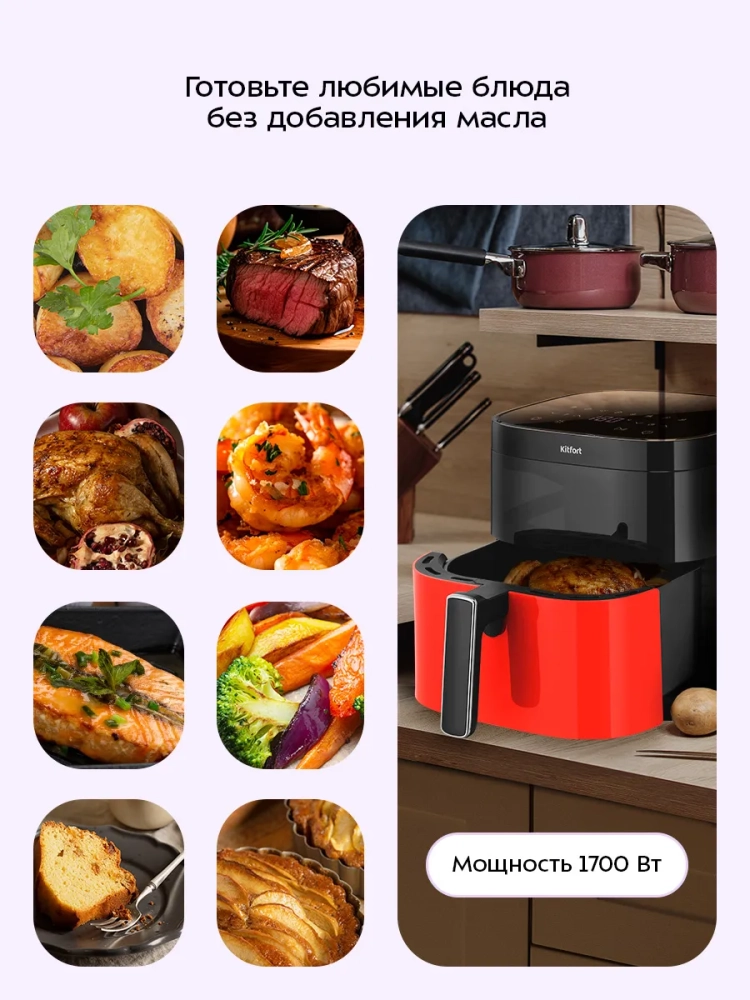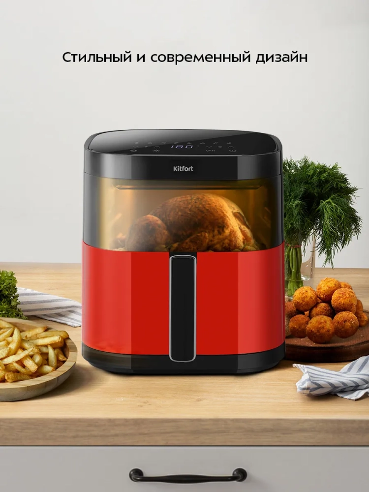 Аэрогриль электрический Kitfort КТ-2291 — это современный настольный прибор, который станет незаменимым помощником на вашей кухне. С его помощью можно готовить большинство блюд, в том числе и выпечку, без добавления масла, сохраняя их сочность и создавая аппетитную хрустящую корочку. Этот аэрогриль может использоваться как гриль, так и сушилка для овощей и фруктов, что делает его универсальной техникой для кухни. Система циркуляции горячего воздуха обеспечивает равномерное обжаривание продуктов со всех сторон. Благодаря этому блюда получаются нежными внутри и хорошо запеченными снаружи. В процессе приготовления не требуется постоянный контроль: вентилятор создает циркуляцию воздуха, предотвращая непропеченные участки. Аэрогриль оснащен сенсорным управлением и 8 автоматическими программами приготовления, которые позволяют использовать готовые настройки под конкретные блюда. На дисплее отображаются температура и время приготовления, а по окончании работы прибор автоматически выключается. Продукты размещаются на специальной решетке в поддоне с антипригарным покрытием. Это облегчает процесс очистки после использования — решетка и чаша легко снимаются для мытья. Объем чаши составляет 5.7 литра при мощности 1700 Вт, что позволяет готовить большие порции за один раз. Аэрогриль Kitfort — это бытовой кухонный электро прибор высокого качества от известного бренда kitfort.