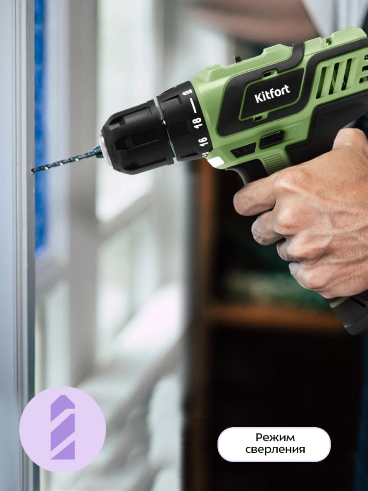 Дрель-шуруповерт КТ-6494 удобно лежит в руке. Устройство оснащено регулятором крутящего момента. Крутящий момент — это показатель, определяющий величину вращающего усилия. Чем он больше, тем в более твердые материалы можно вкрутить шуруп. Также на регуляторе крутящего момента отмечено положение, предназначенное для сверления отверстий.