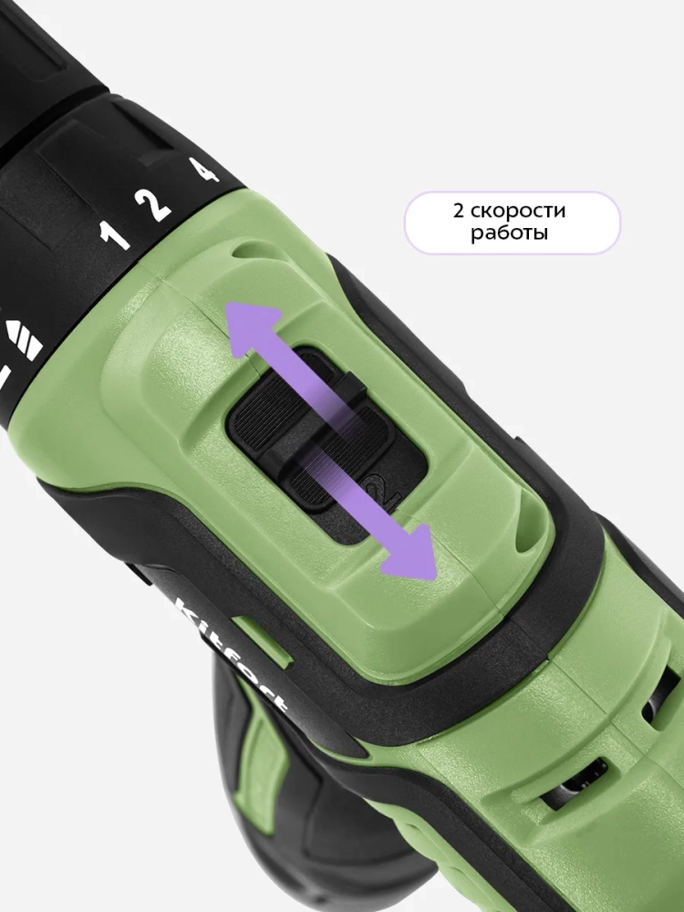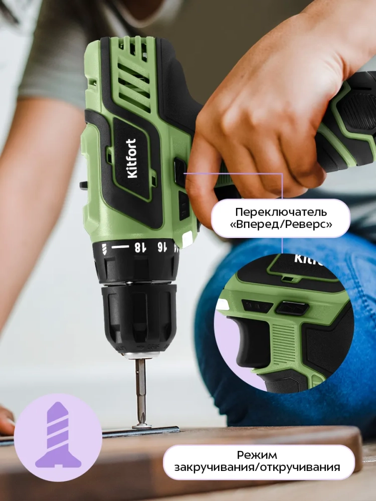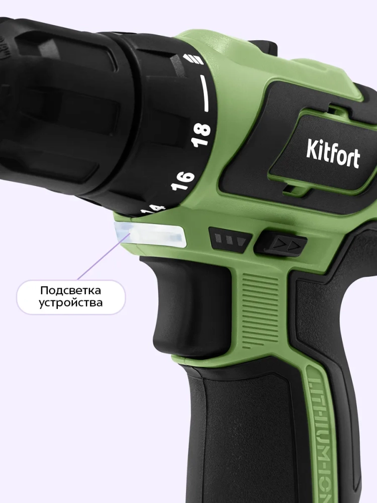Аккумуляторная дрель-шуруповерт Kitfort КТ-6494 поможет вам провести ремонтные работы или собрать мебель. С ней вы легко и быстро сможете закрутить или выкрутить шурупы или винты, а также просверлить отверстия в разных поверхностях. Благодаря подсветке в верхней части устройства будет удобно работать даже в плохо освещенных местах. Подсветка загорается вместе с включением дрели-шуруповерта.