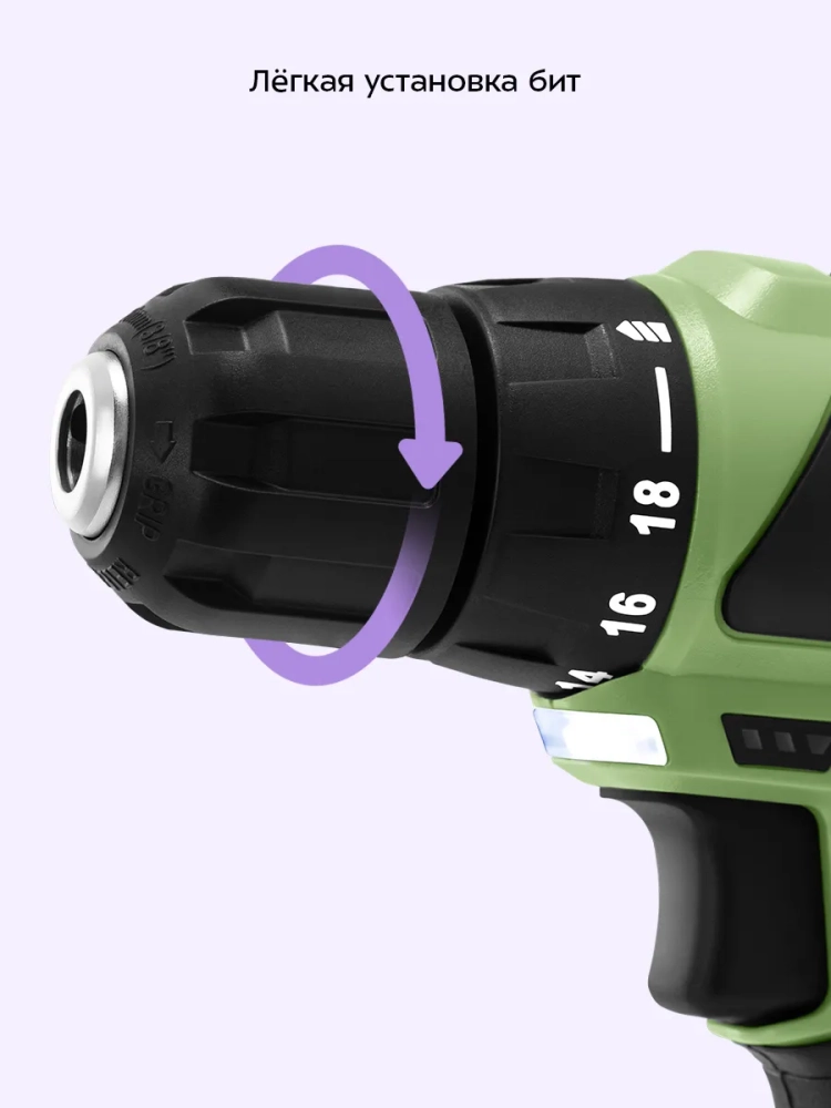 В быстрозажимной патрон можно установить разные биты и сверла (в комплект не входят). Диаметр зажимаемой биты или сверла: 0,8–10 мм.