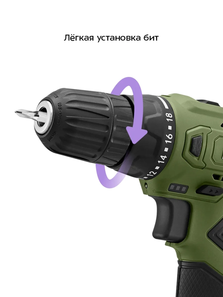 В патрон можно установить разные биты и сверла (в комплект не входят). Диаметр зажимаемой биты или сверла до 10 мм.