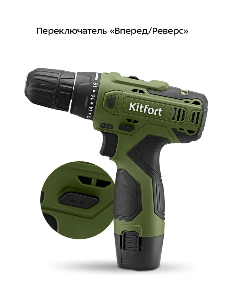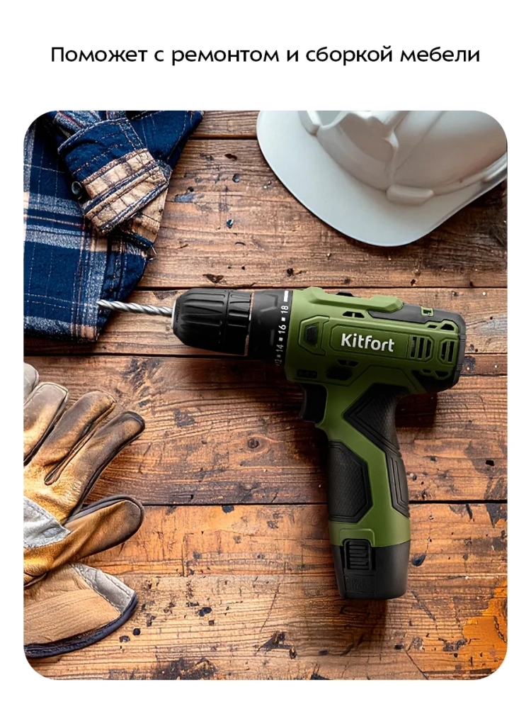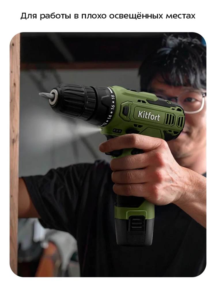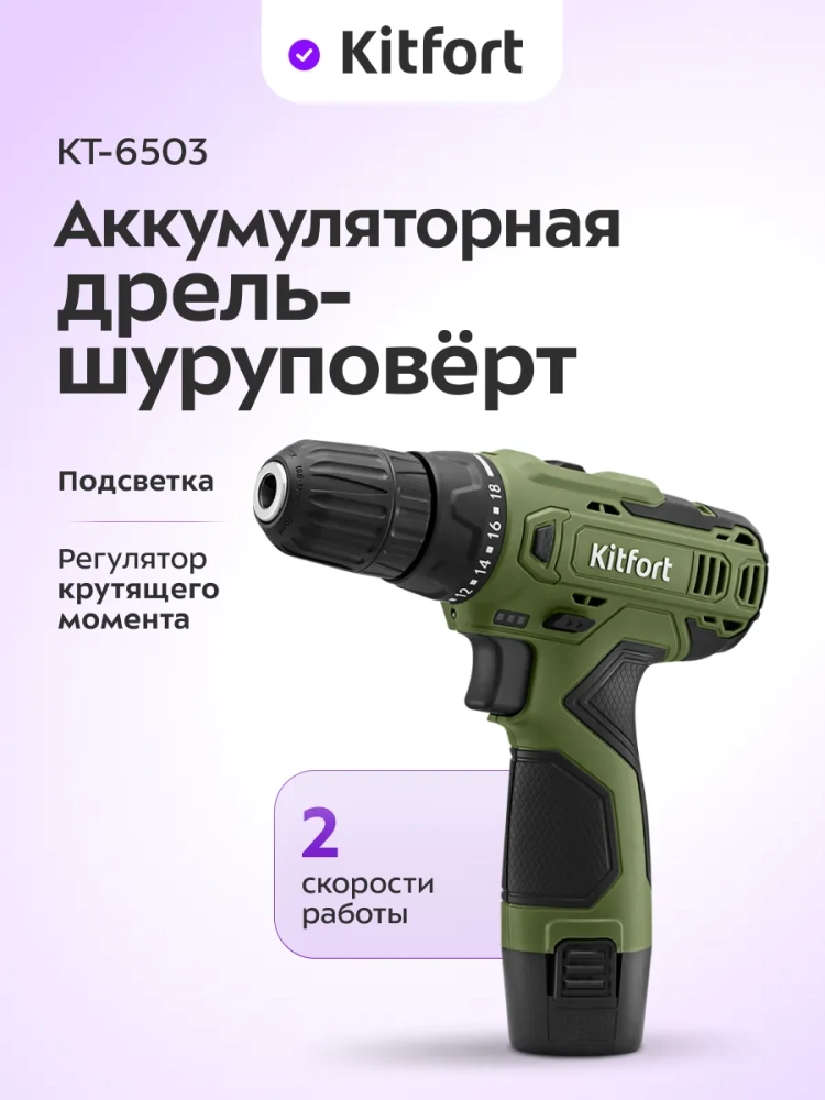 Аккумуляторная дрель-шуруповерт Kitfort КТ-6503 поможет вам провести ремонтные работы или собрать мебель. С ней вы легко и быстро сможете закрутить или выкрутить шурупы или винты, а также просверлить отверстия в разных поверхностях. Благодаря подсветке в верхней части устройства будет удобно работать даже в плохо освещенных местах. Подсветка загорается вместе с включением дрели-шуруповерта.