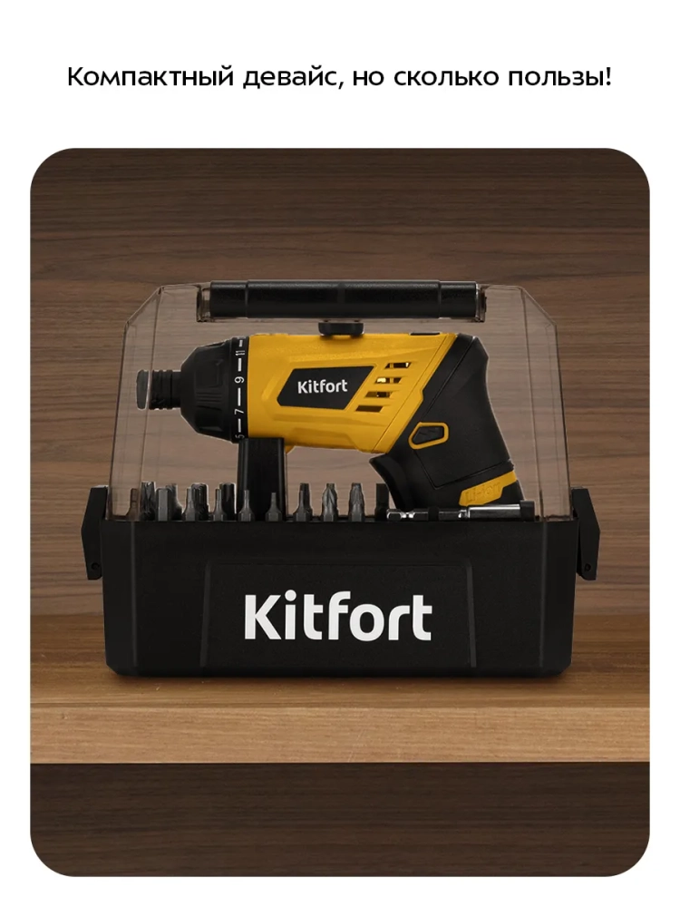 Отвертка, набор бит, удлинитель для бит и блок питания удобно складываются в специальный кейс из комплекта. Кейс имеет небольшие габариты и ручку для переноски, поэтому при необходимости его легко взять с собой.