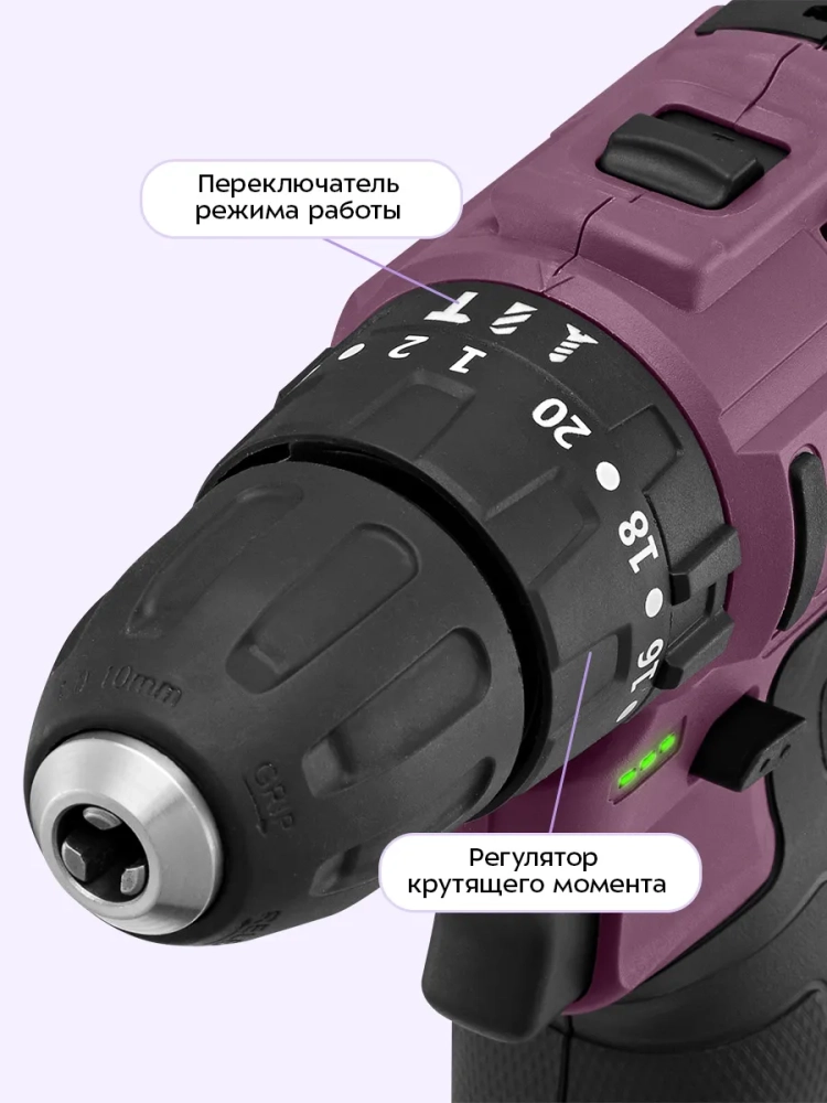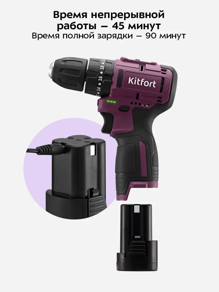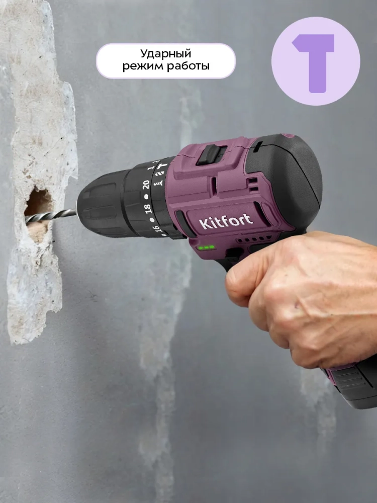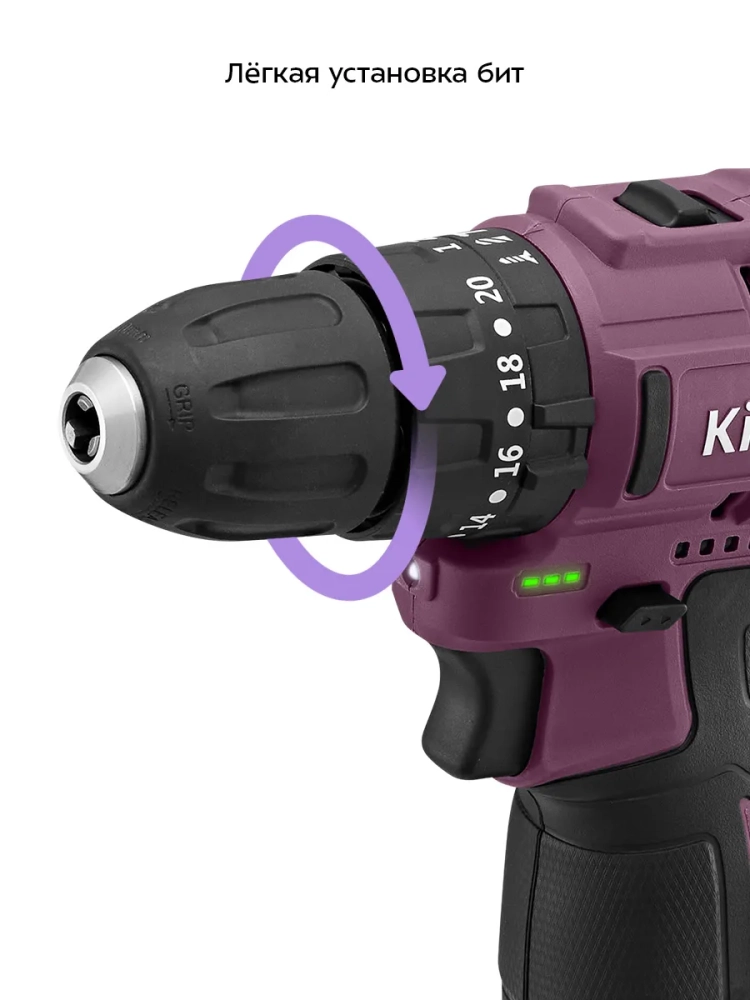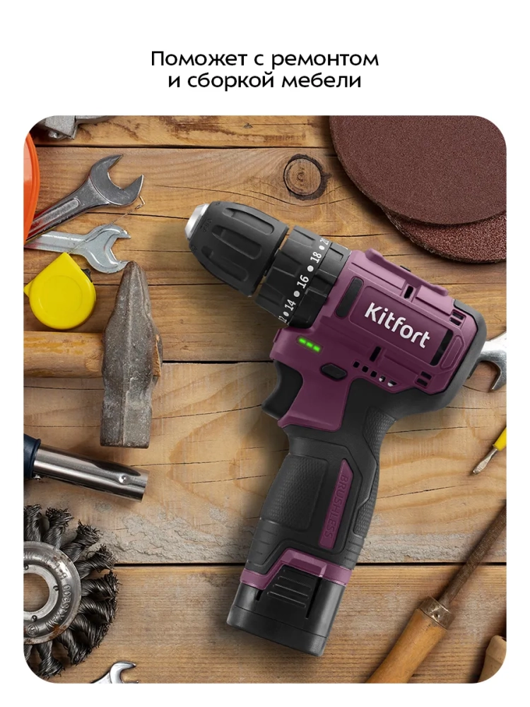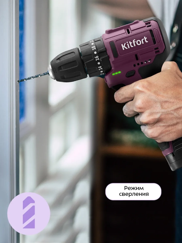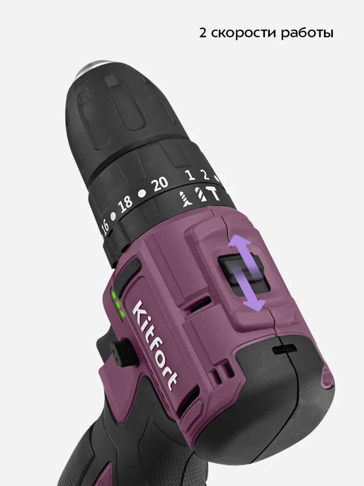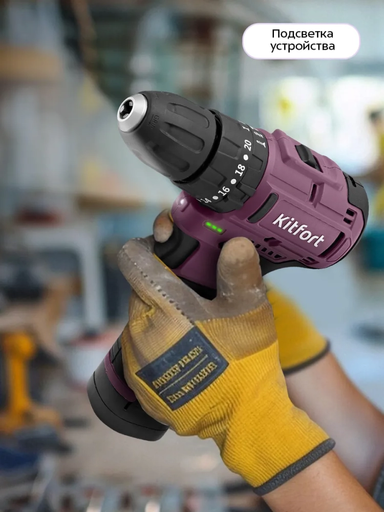 Аккумуляторная ударная дрель-шуруповерт КТ-6505 — это надежный электроинструмент, который станет незаменимым помощником в вашем арсенале. Этот мощный инструмент идеально подходит для выполнения различных ремонтных работ и сборки мебели. Благодаря аккумуляторному питанию, вы сможете использовать его в любом месте без необходимости подключения к сети. Дрель-шуруповерт оснащена ударным режимом работы, что позволяет эффективно справляться с откручиванием прикипевшего крепежа и сверлением небольших отверстий в твердых материалах, таких как бетон. Удобство использования обеспечивается наличием подсветки, которая активируется вместе с включением устройства и позволяет работать даже в условиях недостаточного освещения. Эта модель имеет две скорости работы и регулятор крутящего момента до 40 Н*м, что дает возможность вкручивать шурупы даже в самые твердые материалы. Патрон дрели позволяет устанавливать различные биты и сверла диаметром до 10 мм (не входят в комплект). Максимальное число оборотов холостого хода достигает 1500 об/мин на высокой скорости. Аккумулятор Li-Ion емкостью 2 А*ч обеспечивает длительное время непрерывной работы до 45 минут после полной зарядки за 1,5 часа. Компактные размеры устройства (159 × 59 × 203 мм) делают его удобным для хранения и транспортировки. Уровень шума не превышает ≤83 дБ, что делает работу комфортной даже при длительном использовании.