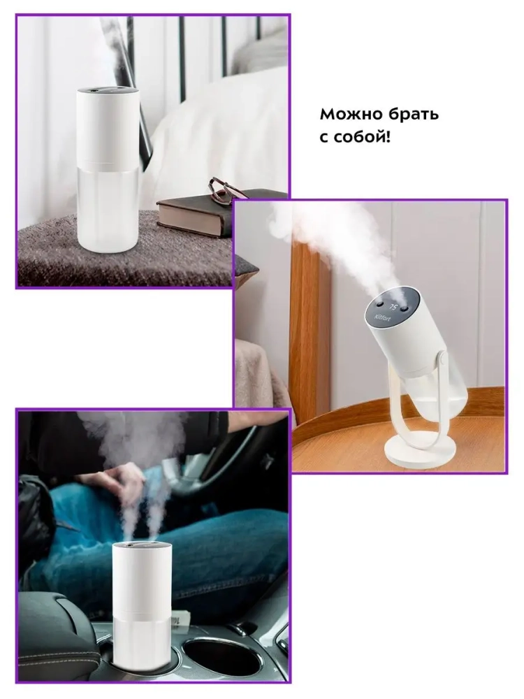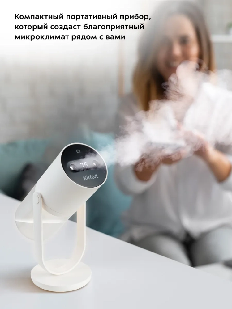 Аккумуляторный увлажнитель воздуха Kitfort КТ-2857 — компактный портативный прибор, который создаст благоприятный микроклимат рядом с вами. Он будет увлажнять воздух вокруг области его размещения, поэтому можно комфортно находиться на рабочем месте, крепко спать или заниматься любыми другими делами, пока рядом с вами находится увлажнитель воздуха. Прибор работает от аккумулятора и заряжается от USB.