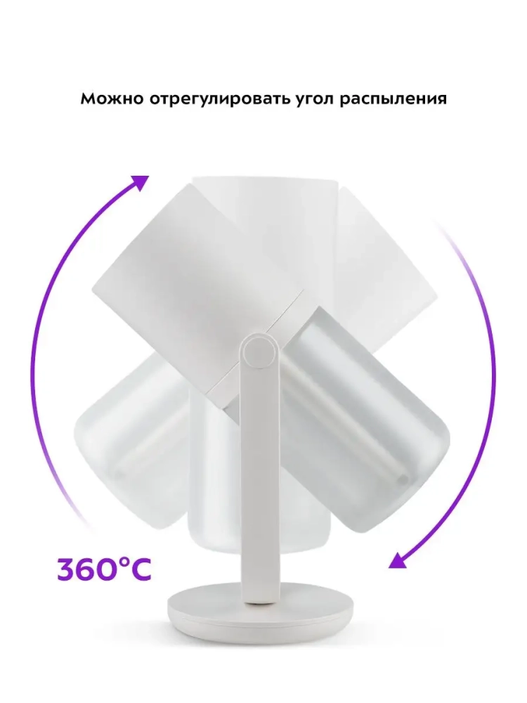 Прибор может располагаться как самостоятельно, так и на подставке, которая идет в комплекте. Благодаря специальной конструкции подставки можно настраивать поворот корпуса, таким образом регулируется угол распыления.