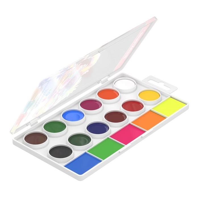 - В наборе: 12 классических цветов и 5 неоновых в увеличенных кюветах.