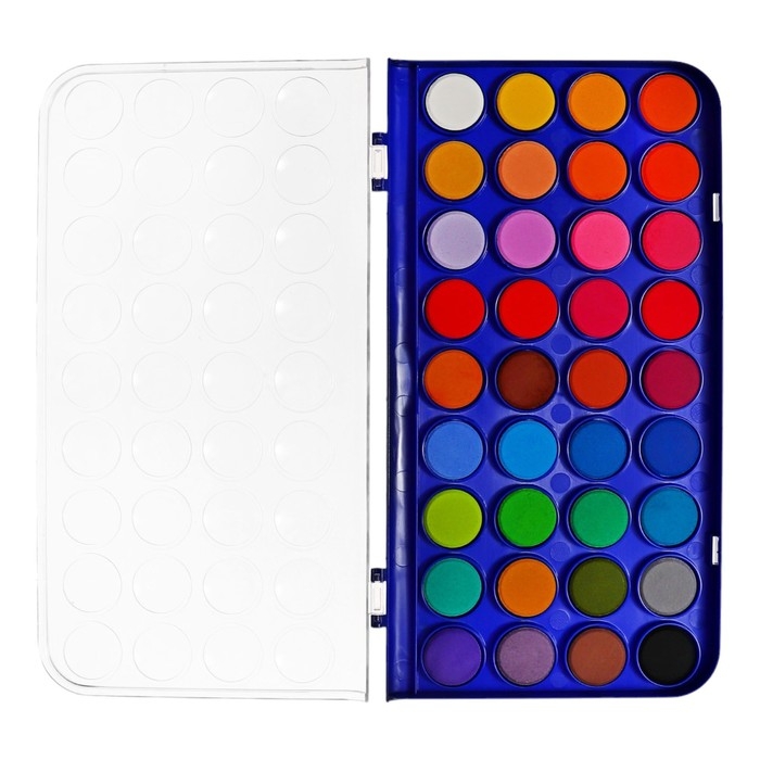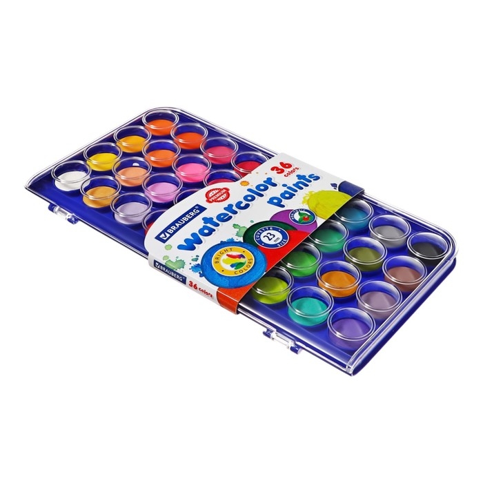 В наборе 36 насыщенных цветов, которые отлично смешиваются, позволяя создавать множество оттенков. Краски легко наносятся, образуя интенсивное яркое покрытие даже при нанесении в один слой. Обеспечивают однородное окрашивание, быстро высыхают и не портятся со временем. Краски безопасны для детей, нетоксичны. Выпускаются в пластиковом пенале с европодвесом, прозрачной крышкой, круглой формой кювет и отделением для кисточки. Съемную пластиковую крышку можно использовать в качестве палитры для смешивания красок.