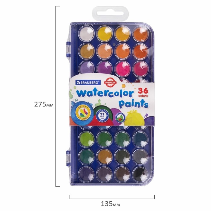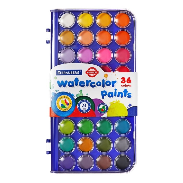 Акварель сухая 36 цветов, BRAUBERG "PREMIUM", круглые кюветы 23 мм, пенал