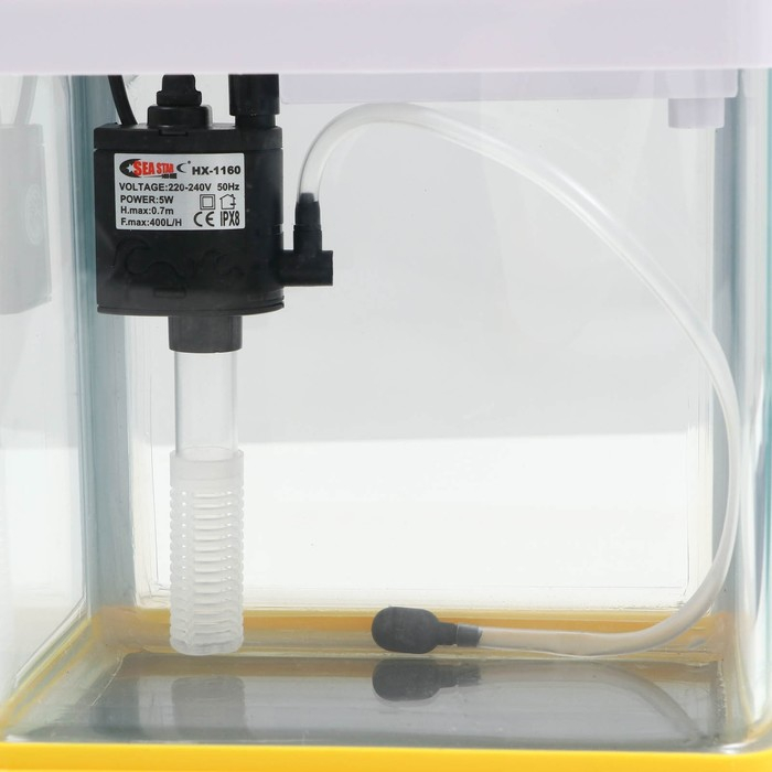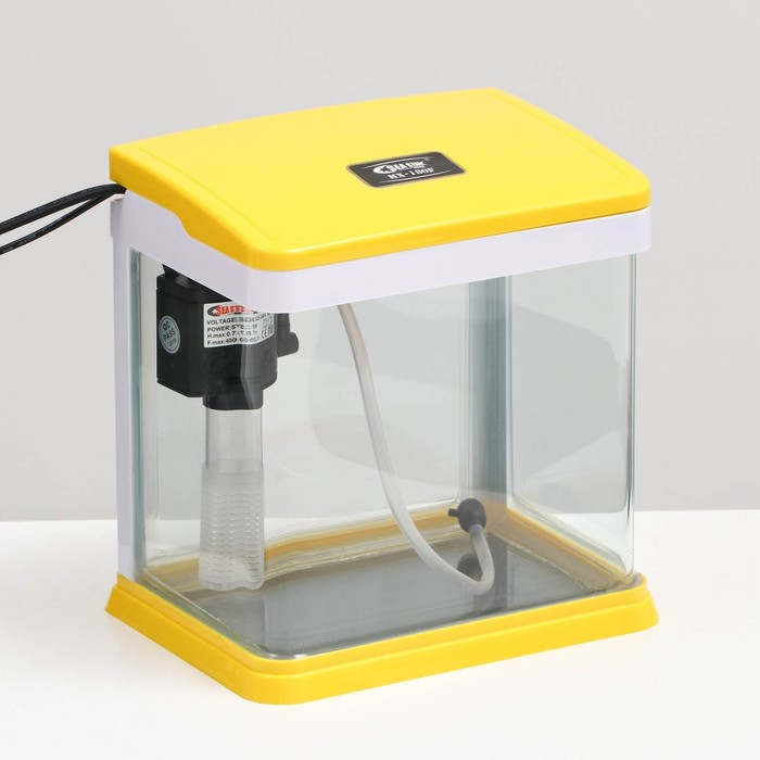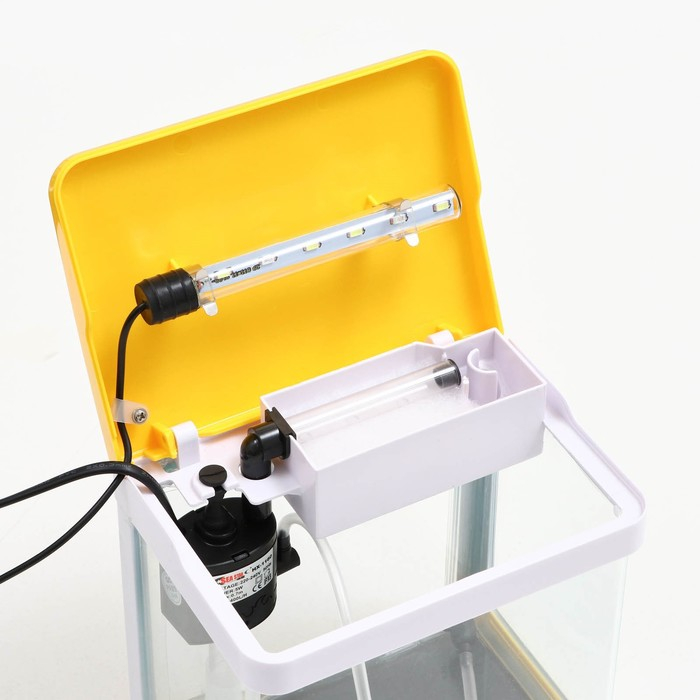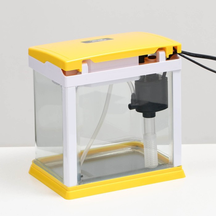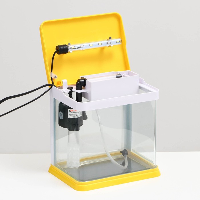 Полезный объем аквариума составляет 3.5 литра. Аквариум полностью готов к работе. Фильтр и светодиодная лампа встроены в крышку аквариума.