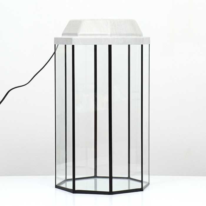 Аквариум "Восьмигранный" с крышкой, изготовлен из прочного стекла, благодаря евро кромке имеет высокую защиту от трещин, сколов, что повышает степень безопасности при эксплуатации. Также крышка надежно защищает аквариум от пыли, оснащена патроном под лампу Е14, светодиодной лампой Е14, 7 ватт с защитным плафоном, что позволяет создавать оптимальное освещение для растительности и рыбок, наблюдать за жизнью подводного мира можно даже ночью. Этот аквариум дает полный обзор из-за своих изгибов, отличный выбор для любителей водных растений и животных. Указан номинальный объём аквариума.