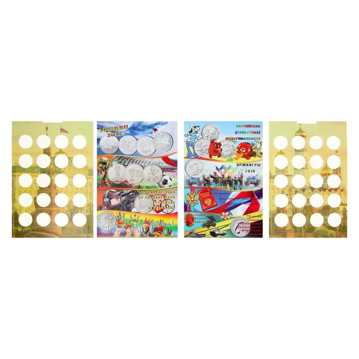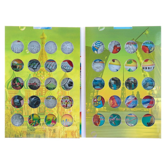 В альбоме-планшете для Вашего удобства отсутствуют подписи для монет, поэтому Вы можете поместить те монеты, которые захотите. Размер ячейки 27 мм - каждая монета плотно сидит в ячейке и не вываливается. Монеты видны с двух сторон.
