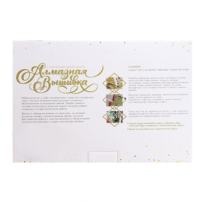 Часть картины предстоит заполнить стразами, другая часть напечатана на холсте-основе — такое изделие легче и быстрее создать. Поэтому набор подойдёт для тех, кто впервые пробует свои силы в этой технике или любит быстро добиваться результата.