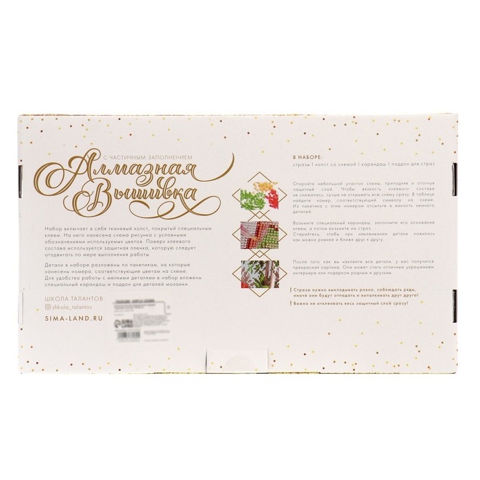 Часть изображения предстоит заполнить стразами, другая часть напечатана на холсте-основе. Поэтому набор подойдёт для тех, кто впервые пробует свои силы в этой технике или любит быстро добиваться результата.