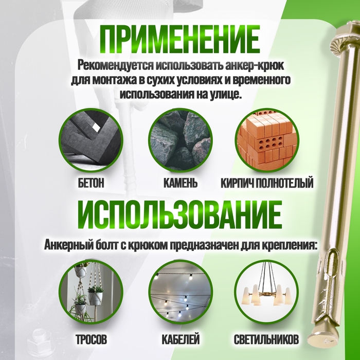 Анкерный болт с гайкой может использоваться для крепления светильников, зеркал, полок, труб и других предметов.