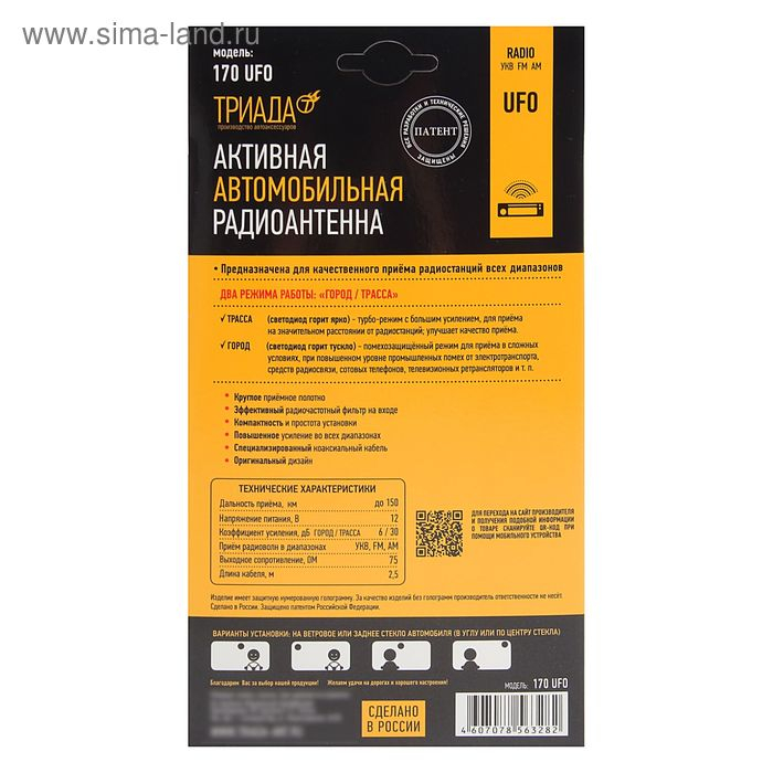 Антенна активная "Триада-170 Ufo", всеволновая, помехозащищенная, город/трасса, до 150 км