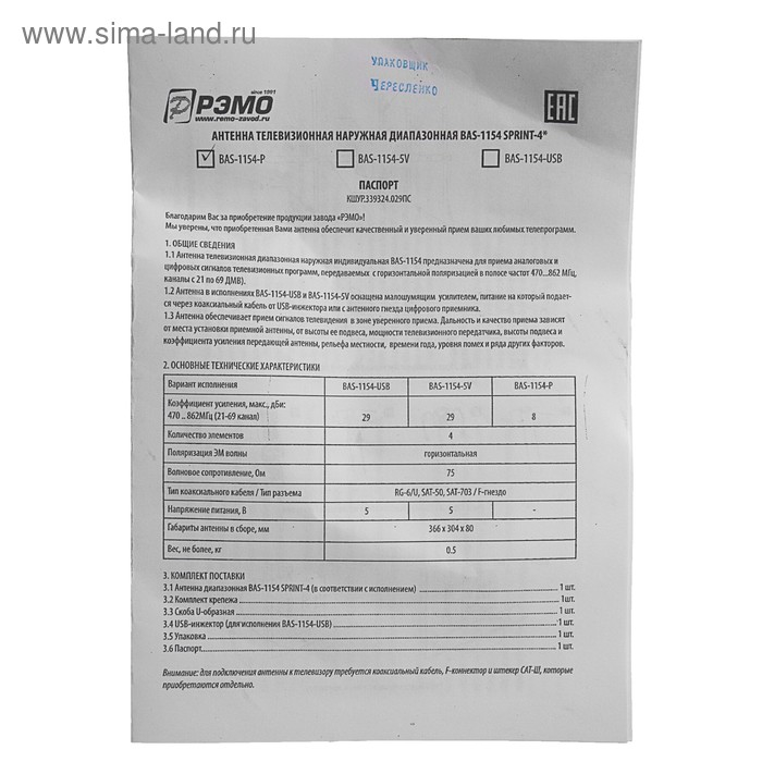 Антенна "РЭМО" BAS-1154-P SPRINT-4, уличная, пассивная, 8 дБи, DVB-T, DVB-T2, цифровая