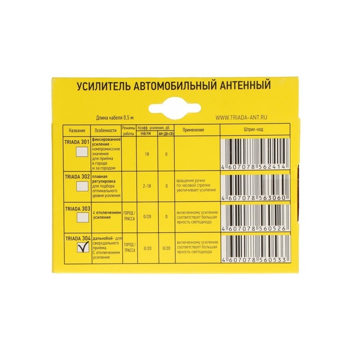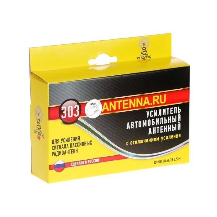 Автомобильный антенный усилитель ""Триада -303"" 16 дБ УКВ и FM с отключением усиления. Рекомендуется к применению, если расстояние от радиостанции до маршрута езды автомобиля обычно составляет 50-100 км и прием на внешнюю пассивную антенну сопровождается шумами, пропаданиями сигнала. типичное применение - использование автовладельцами, проживающими в сельской местности и периодически выезжающих в город. В этом случае производится отключение усиления кнопкой на корпусе усилителя.