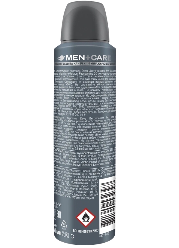 Почувствуйте мощную защиту от пота и белых пятен на одежде с Антиперспирантом аэрозолем DOVE Men Экстразащита без белых следов. Этот дезодорант содержит полупрозрачные ингредиенты, которые не оставляют следов на рубашках, обеспечивая необходимую защиту на 48 часов. Состав: Isobutane, Aluminum Chlorohydrate, PPG-14 Butyl Ether, Cyclopentasiloxane, Propane, Parfum, Butane, Disteardimonium Hectorite,Helianthus Annuus Seed Oil, C12–15 Alkyl Benzoate, Octyldodecanol, BHT, Dimethiconol, Propylene Carbonate, Tocopheryl Acetate,CItric Acid, Alpha-Isomethyl Ionone, Butylphenyl Methylpropional, CItronellol, Coumarin, Hexyl CInnamal, Hydroxyisohexyl3-CyClohexene Carboxaldehyde, Limonene, Linalool.