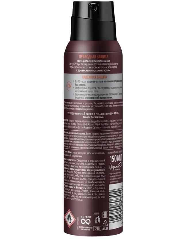 Антиперспирант-спрей мужской ФА Men Природная защита с ароматом гуараны ‒ ощутите надежную защиту мужских дезодоранта от ФА Men. Мужской дезодорант-антиперспирант. До 72 часов защиты без солей алюминия. Веган-формула. Состав: Butane, Propane, Aluminum Sesquichlorohydrate, Ethylhexyl Palmitate, Isobutane, Triethyl Citrate, C9-12 Alkane, PPG-14 Butyl Ether,Parfum (Fragrance), Disteardimonium Hectorite, Propylene Carbonate, Limonene, Benzyl Alcohol.
