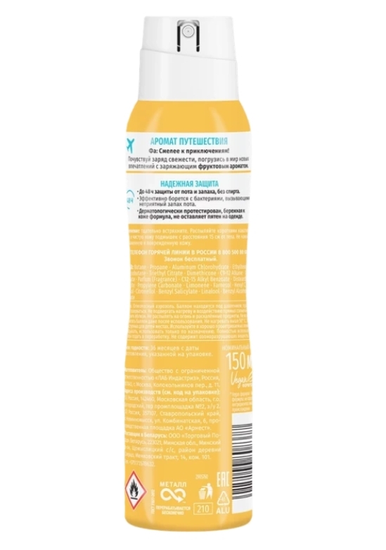Антиперспирант-спрей женский ФА Создай настроение, Заряд позитива ‒ смелее к приключениям! Почувствуйте заряд свежести, погрузись в мир новых впечатлений с заряжающим фруктовым ароматом. Аэрозоль женский дезодорант-антиперспирант. До 48 ч защиты от пота и запаха, без спирта. Формула с технологией раскрытия аромата обеспечивает ощущение длительной свежести и активирует аромат, когда это особенно необходимо. Дерматологически протестирован, бережная к коже формула, не оставляет пятен на одежде. Веган формула: не содержит ингредиентов животного происхождения. Состав: Butane, Propane, Aluminum Chlorohydrate, Ethylhexyl Palmitate, Isobutane, Triethyl Citrate, Dimethicone, C9-12 Alkane, IsopropylMyristate, Parfum (Fragrance), C12-15 Alkyl Benzoate, Disteardimonium Hectorite, Propylene Carbonate, Limonene, Farnesol, HexylCinnamal, Geraniol, Citronellol, Benzyl Salicylate, Linalool, Benzyl Alcohol, Methyl Benzoate.