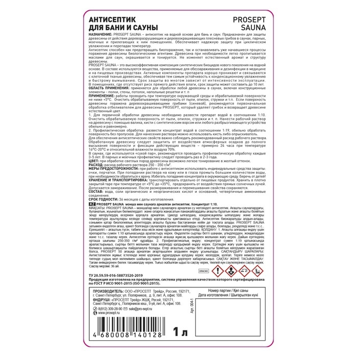 PROSEPT SAUNA выпускается в виде водоразбавимого концентрата.