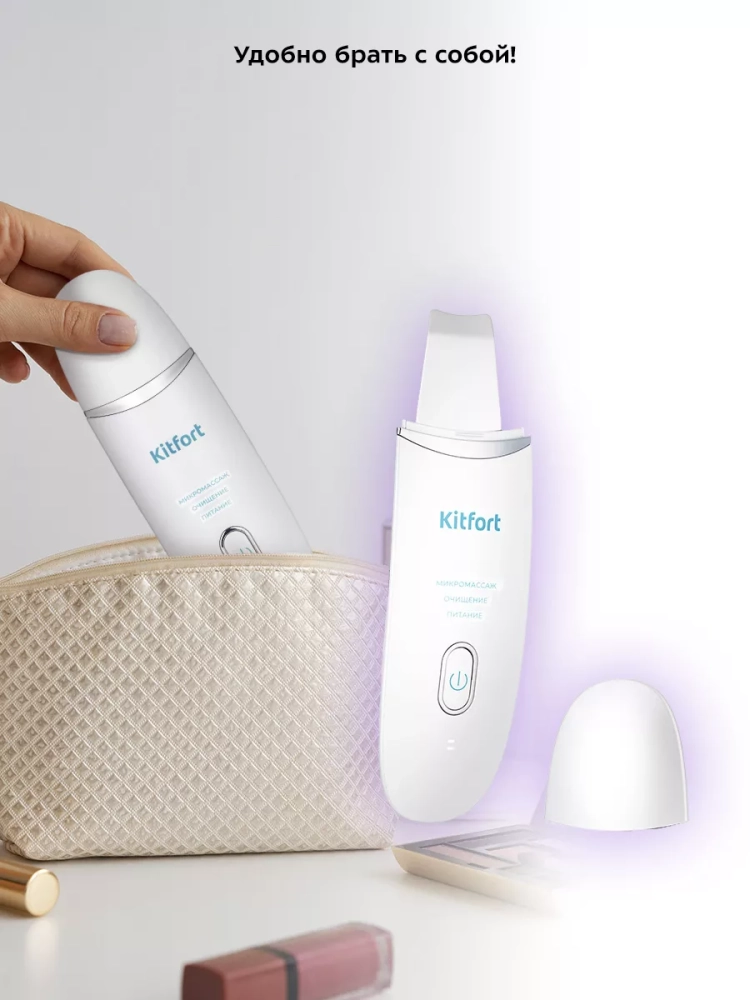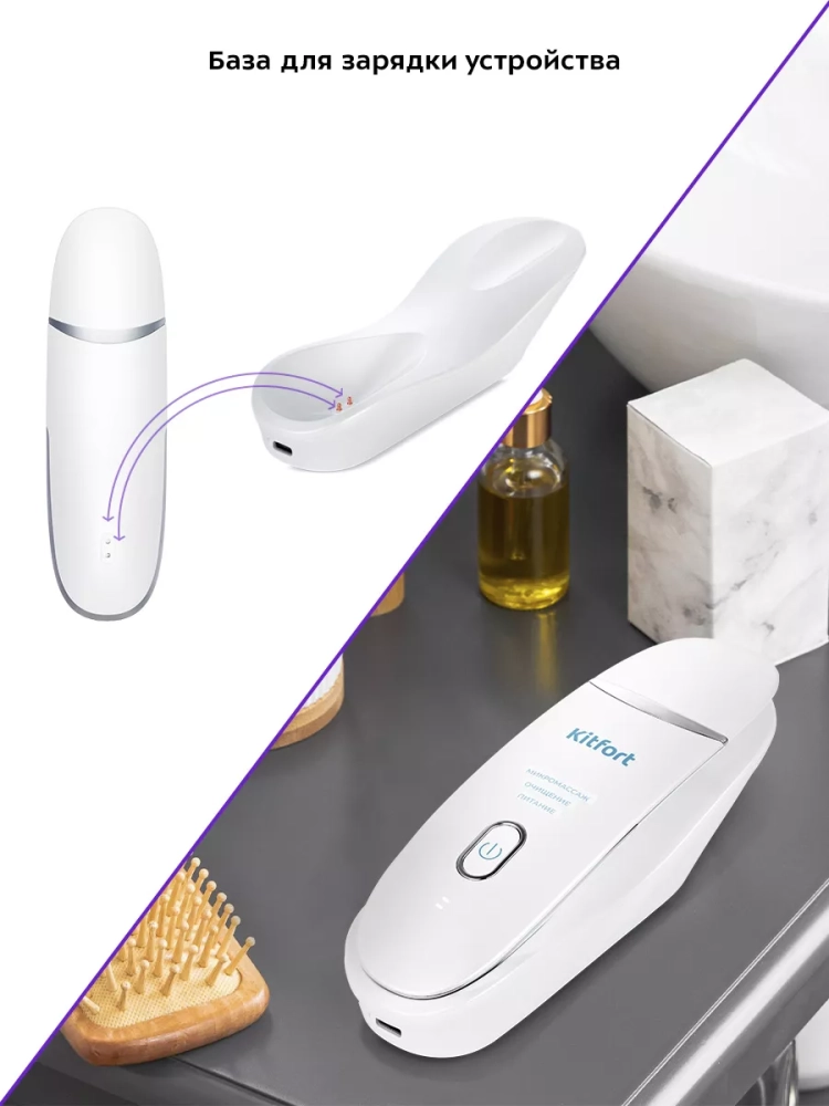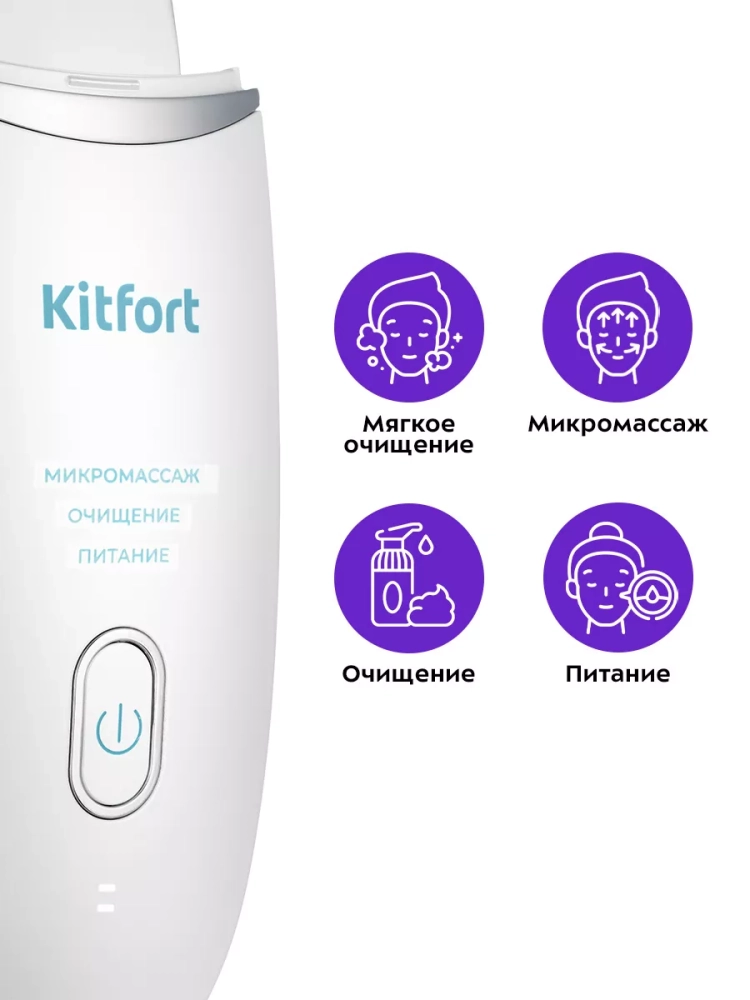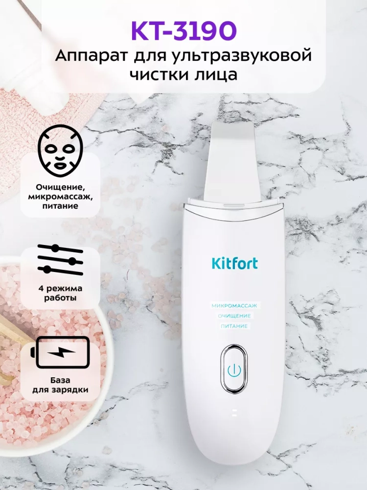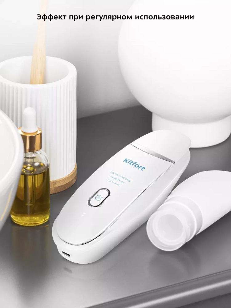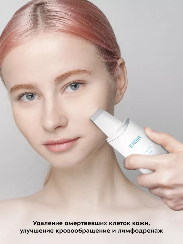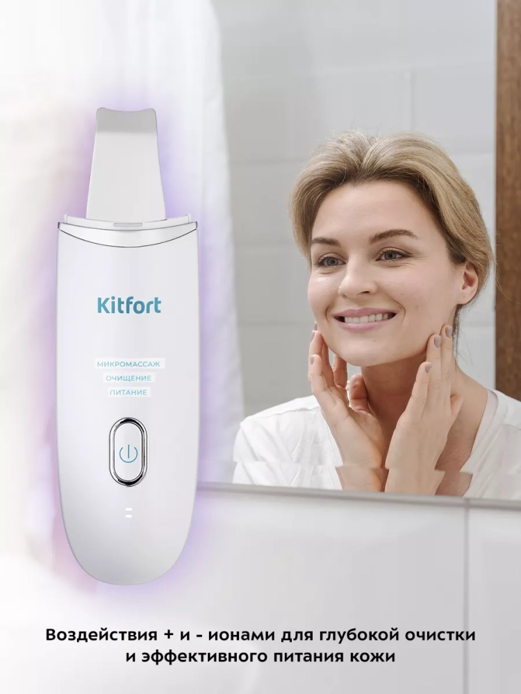 Аппарат для ультразвуковой чистки лица Kitfort KT-3190 предназначен для удаления омертвевших клеток кожи, избытка кожного сала и черных точек, способствует улучшению кровообращения и лимфодренажу. Использование прибора способствует повышению эластичности кожи и увеличивает эффективность от применения питательных косметических средств. Ультразвуковая чистка также помогает сузить поры и выровнять цвет кожи. Ультразвуковую чистку лица обязательно проводят с использованием жидкой контактной среды, например, специальных лосьонов и гелей для ультразвуковой чистки. Также вы можете использовать тоник или лосьон, которые вы применяйте для ежедневного ухода. Когда ультразвуковая волна попадает в жидкую среду, происходит эффект кавитации: в жидкости создаются пузырьки, которые затем лопаются, благодаря чему загрязнения выбиваются с поверхности кожи. Дополнительно у прибора есть функции воздействия на кожу положительными и отрицательными ионами. Воздействие положительными ионами способствует глубокой очистке и повышению эластичности кожи. Воздействие отрицательными ионами улучшает эффективность питания кожи уходовыми средствами и гидробаланс. Устройство работает в 4 режимах: • мягкое очищение; • микромассаж; • очищение; • питание. В комплекте с устройством идет база для зарядки и шнур USB Type-C. Внимание! Прибор не является медицинским средством и используется только в профилактических целях. Мощность: 2,4 Вт. Аккумулятор: Li-Ion 3,7 В, 0,5 А*ч (1,85 Вт*ч). Частота ультразвуковых колебаний: 24000 Гц. Уровень шума: ≤40 дБ. Время зарядки: 4 ч. Время работы от аккумулятора: 1 ч. Количество режимов работы: 4. Автоотключение: через 8 мин. Длина шнура USB Type-C: 0,7 м. Размер устройства: 51 х 30 x 173 мм. Размер устройства на базе: 174 х 52 х 50 мм