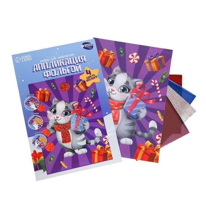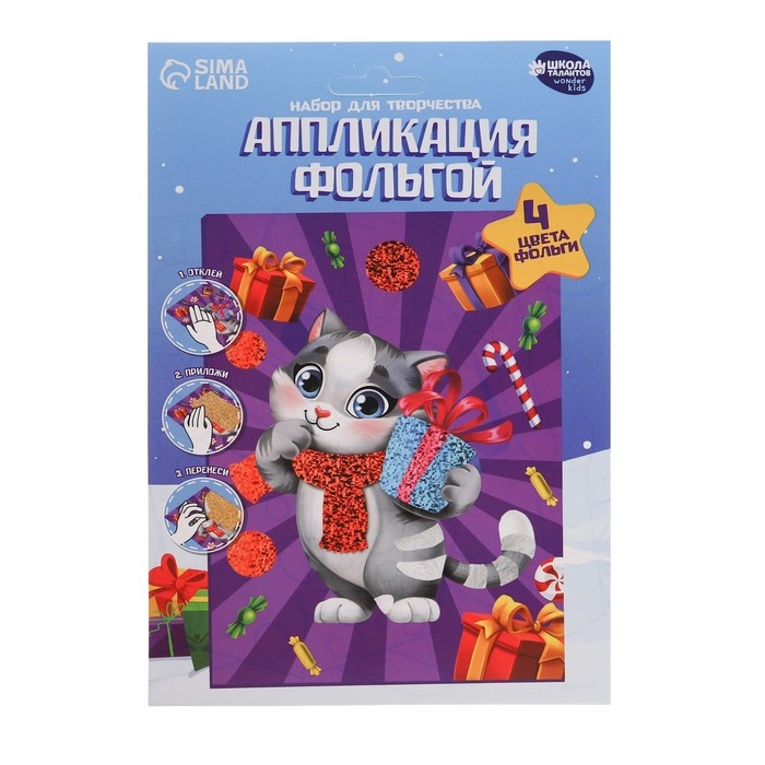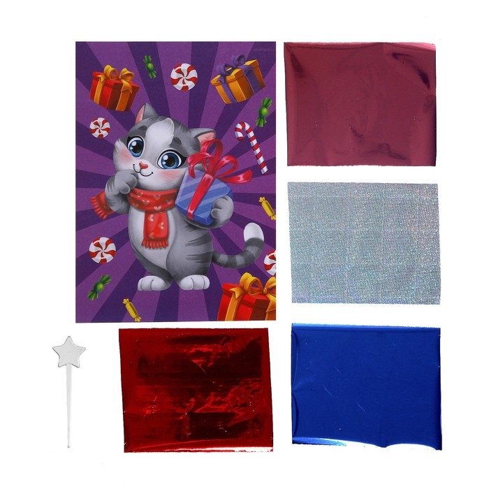Аппликация фольгой на новый год «Котик и подарки», новогодний набор для творчества