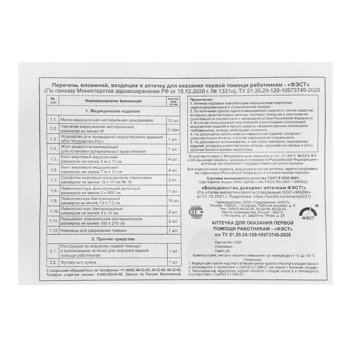 Аптечка для оказания первой помощи работникам "ФЭСТ", мягкий футляр