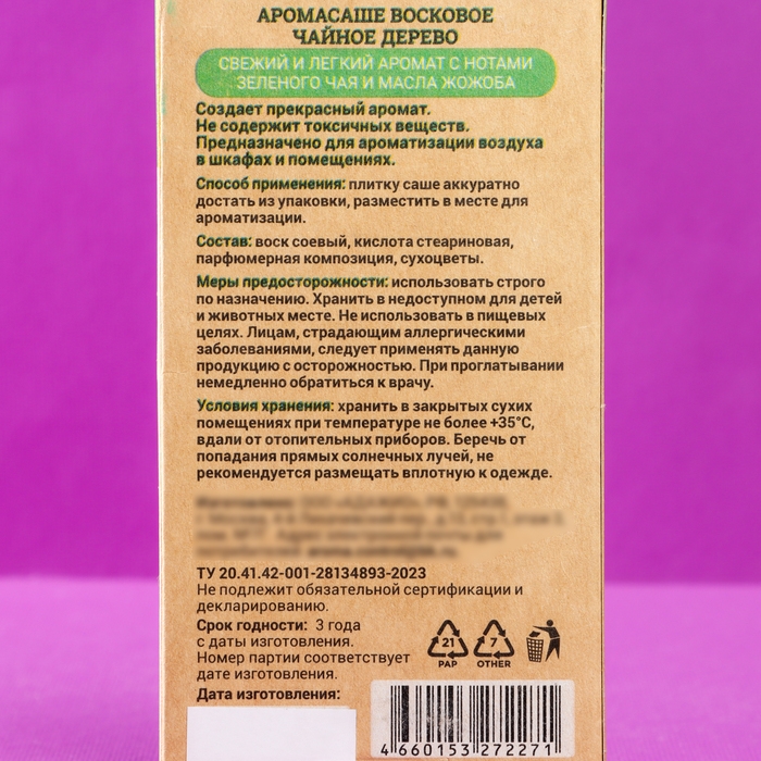 Аромасаше восковое с ароматом чайного дерева – это натуральный ароматизатор, предназначенный для использования в автомобиле. Оно имеет компактный размер и удобную форму, что позволяет разместить его под сиденьем, обеспечивая приятный аромат и создавая уютную атмосферу в салоне автомобиля.
