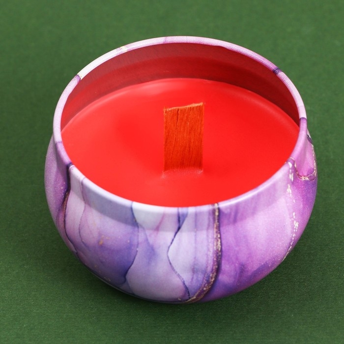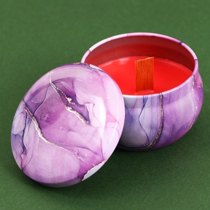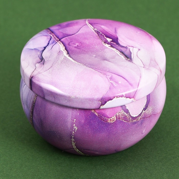 Свеча изготовлена в виде круглой баночки с лиловым рисунком.