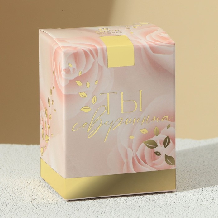 Свеча упакована в картонную коробку, оформленную в том же стиле, что и сама свеча, с изображением роз и золотым надписями «SEE YOU HOME».
