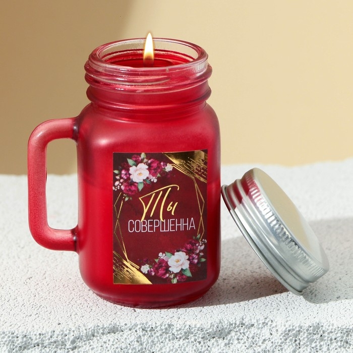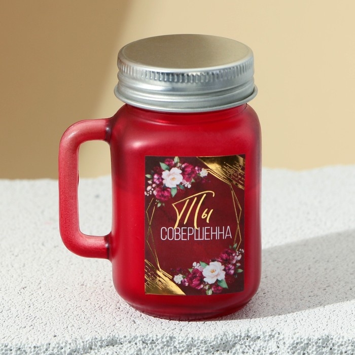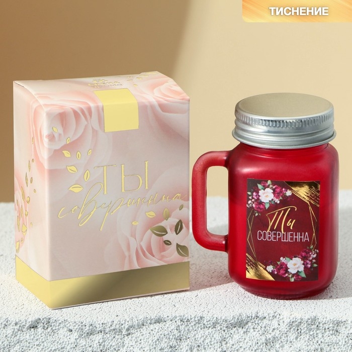 Свеча упакована в стильную стеклянную банку с ручкой, украшенную наклейкой с изображением роз и надписью "Ты совершенна".