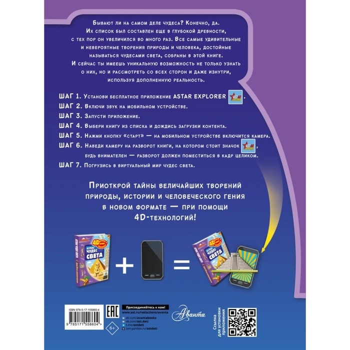 Эта книга расскажет тебе о них и даже покажет в цвете, объеме и в мельчайших деталях самые прекрасные творения природы и человеческих рук, достойные называться словом «чудо». А чтобы знаменитые памятники культуры, истории и природы «ожили» и «заговорили», приоткрывая свои тайны, необходимо будет лишь скачать приложение Astar explorer на мобильное устройство, настроить его и действовать согласно инструкции.