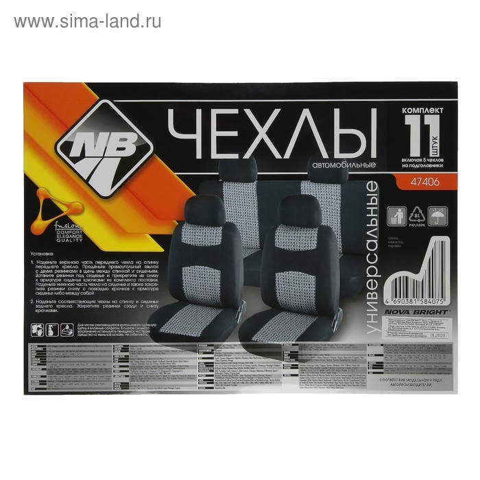 Чехлы на сиденья Nova Bright изготовлены из прочного и износостойкого полиэстера с вставками из жаккарда. Данный материал устойчив к загрязнениям, не теряет свою форму при длительном использовании, не линяет и практически не впитывает влагу. При пошиве изделия используется поролоновая вставка толщиной 3 мм. Комплект состоит из 11 элементов и включает в себя защитные чехлы на водительское, пассажирское и заднее сидения, а так же пять чехлов на подголовники. Эластичность материала и универсальное крепление позволяют использовать защитные чехлы на широком спектре моделей автомобилей.
