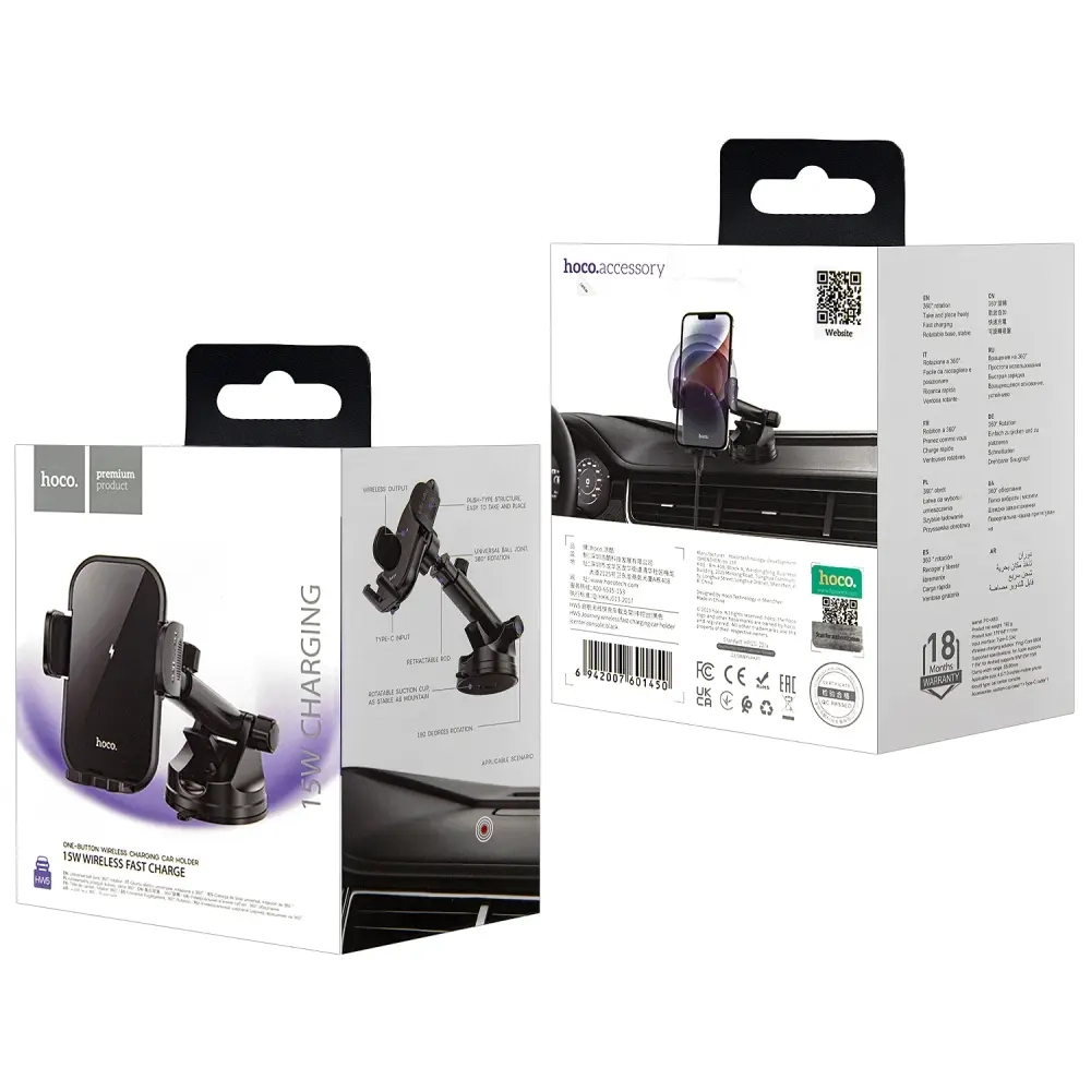 Автодержатель HW5 с беспроводной зарядкой HOCO черный