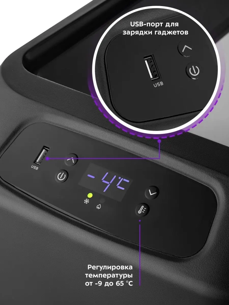 На панели управления автомобильного холодильника предусмотрен разъем USB для питания и зарядки различных устройств и гаджетов. Выходной ток 2 А позволит быстро заряжать любые устройства.