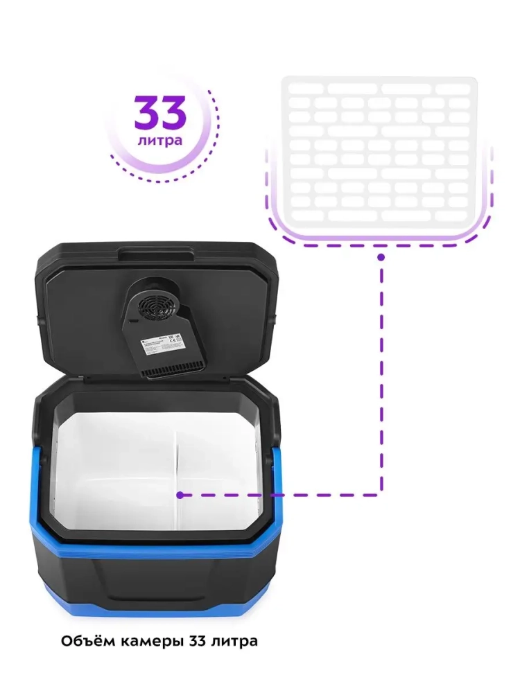 В комплекте к устройству идет съемная разделительная решетка, которая можно использовать, чтобы продукты в камере не перекатывались и не помяли друг друга. На крышке прибора расположена ручка для удобной транспортировки, которая блокирует крышку в закрытом состоянии. Так как система охлаждения/нагрева находится в крышке, то необходимо обеспечить циркуляцию воздуха только сверху и с задней стороны крышки. Это особенно удобно при использовании холодильника в автомобиле, так как рядом с устройством вы можете поставить сумки, пакеты и другие вещи.