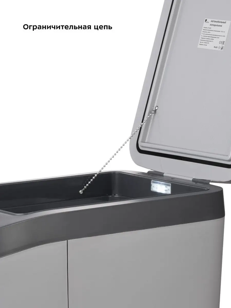 Крышка автомобильного холодильника оснащена ограничительной цепью, которая расположена рядом с петлями.